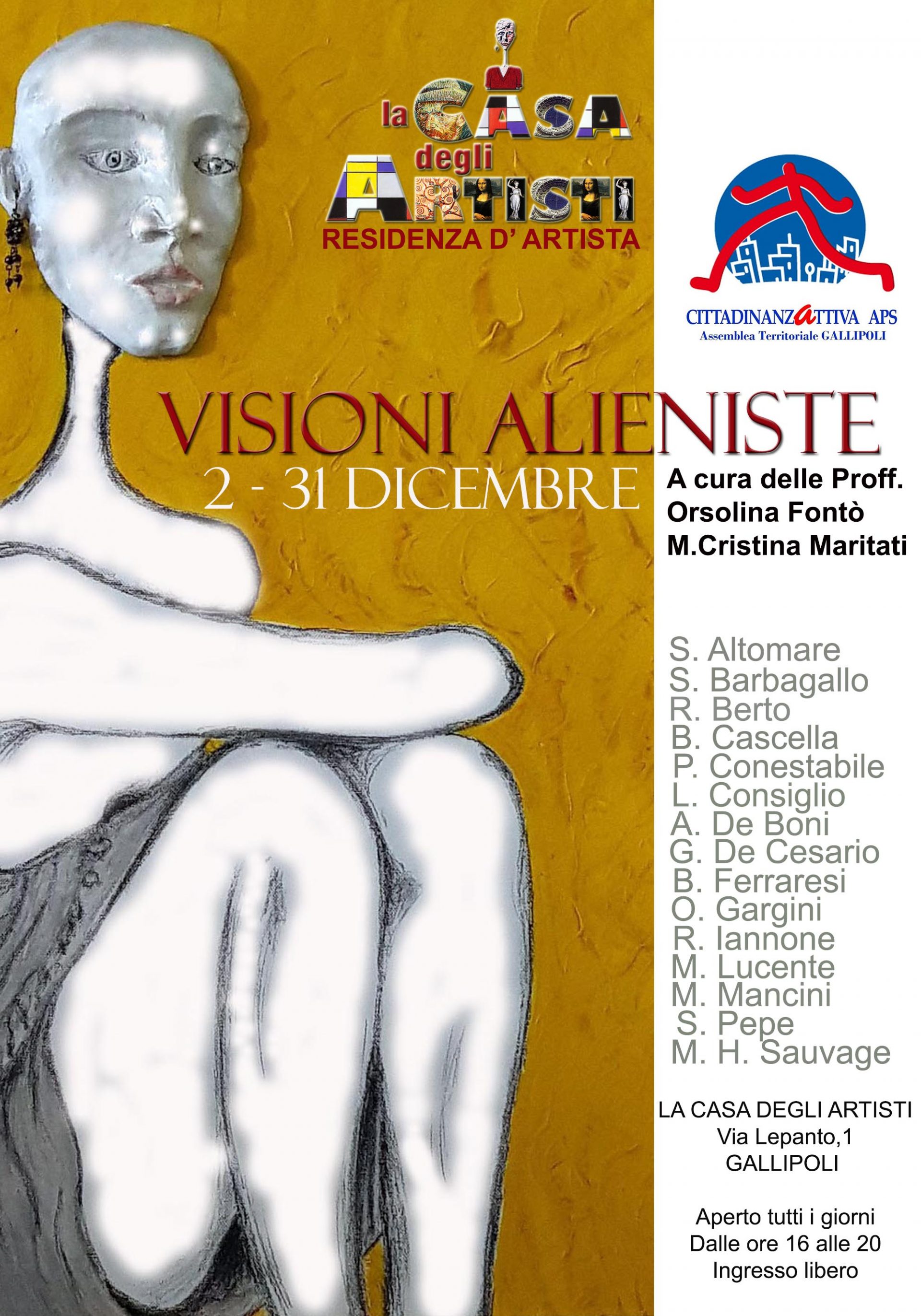 Dopo una battuta d’arresto durata un paio di anni a causa delle restrizioni anti-covid, “La Casa degli Artisti“ di Gallipoli, residenza dell’artista Giorgio De Cesario, riprende le sue manifestazioni culturali con una grande Mostra delle Donazioni dal titolo “ Visioni Alieniste”, a cura delle Proff. Orsolina Fontò e Maria Cristina Maritati con la direzione artistica di Giorgio De Cesario e la collaborazione di CittadinanzAttiva APS Gallipoli.