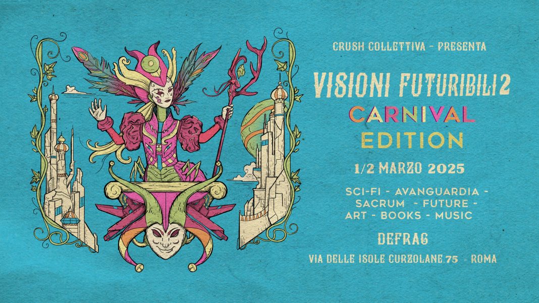CRUSH Collettiva presenta VISIONI FUTURIBILI 2 | Carnival Edition, la seconda edizione dell’evento artistico, culturale e divulgativo a tema futuro e futuribile, che si tinge quest’anno di riflessioni e approfondimenti sui concetti di sacro, rito, icona, reliquie, maschera e travestimento festivo in un’ottica proiettata verso i tempi che verranno, attraverso realtà e immaginari fantastici e speculativi.