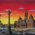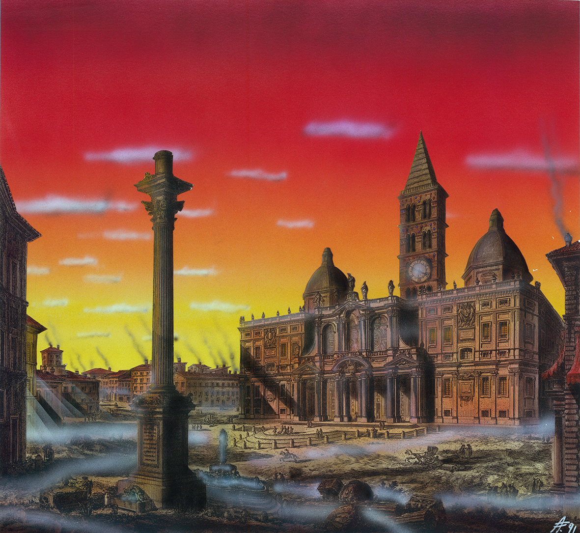 Visioni oniriche atemporali è una mostra sulla nuova dimensione della realtà in cui si coniugano più profondità temporali, caratterizzate dall’utilizzo di varie tecniche per realizzare le opere quali: il fumetto, la grafica di Piranesi, la fotografia, il disegno architettonico e paesaggistico del mondo contemporaneo, il video. Il risultato è la visione di un universo atemporale in cui il passato e il futuro si uniscono per formare un continuo presente. È la condizione percettiva della nostra epoca, definita e profilata dall’uso di tecnologie multimediali. Un universo di immagini che incrocia personaggi e momenti della storia trascorsa con il contesto attuale, creando un continuo spaesamento cronologico assolutamente originale rispetto al sentire dei nostri antenati. Le città ideali sono il grande sogno che ha trasformato le diverse epoche dell'umanità in immensi laboratori di riprogettazione dell’universo dei segni.