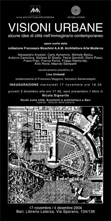 S’inaugura mercoledì 17 novembre nella libreria Laterza, una mostra di opere scelte dalla collezione A.A.M. Architettura Arte Moderna di Francesco Moschini. Le opere fanno da sfondo ideale ai testi della casa editrice e di rimando i volumi presenti saranno la conferma della straordinarietà di una collezione di opere/testimonianze