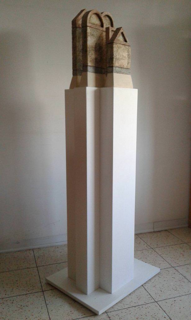 Lucia Di Miceli usa segni e colori secondo il ricordo della luce siciliana e della chiesa vicina alla sua abitazione. Quella visione continua a lavorare nell’elaborazione della coesistenza di diverse forme creando un’energia estensiva che accoglie i processi storici. La consapevolezza determina la costruzione del percorso come ricerca del proprio incontro di luce, nel senso sacrale del mosaico, come progetto strutturato sul senso emozionale e sulla sua prospettiva. Le linee, gli scintillii delle superfici colorate, dei mosaici dorati concorrono nell’elaborazione della poetica, nell’architettura del pensiero. Con “My city”, titolo della sua opera, Di Miceli fa coincidere la forma e la funzione dell’opera con la visione sentimentale del luogo natio. Per Oriano Zampieri il passato, la memoria storica guida la percezione dei luoghi, che l’artista sente come disposizione verso un divenire. Zampieri lavora la ceramica spazialmente, come corpo da attraversare, percorrere per giungere in una dimensione altra, come piacere della scoperta del tempo che ritorna con altri abiti, celando l’essenza. In tal senso l’artista costruisce la sua visione urbana attorno al frontone, simbolo greco-romano di potere divino e, come il ponte, emblema di unione sociale. Minou Amirsoleimani percepisce la città come luogo d’incontro il cui centro è segnalato da una sorta di totem, che si sottrae a ogni comunicazione in cui individuare un’appartenenza: è il luogo del mondo, della sua anima. La scultura, dal titolo “Punto d’incontro”, è realizzata con la tecnica della cartapesta lavorata con carta bianca. L’impronta di una linea silenziosa invita lo sguardo e il pensiero a seguirla nel percorso a spirale, nel perenne inseguimento di qualcosa d’imprendibile. L’introduzione del vuoto all’interno della massa scultorea, nella cultura occidentale s’inscrive nella ricerca di equilibri. Nel pensiero orientale il rapporto con il sé inizia con la ricerca del proprio frammento d’infinito, come esercizio quotidiano, da cui ricostruire la visione generale e che l’artista Amirsoleimani cerca di cogliere e restituire come espressione del proprio sguardo.
