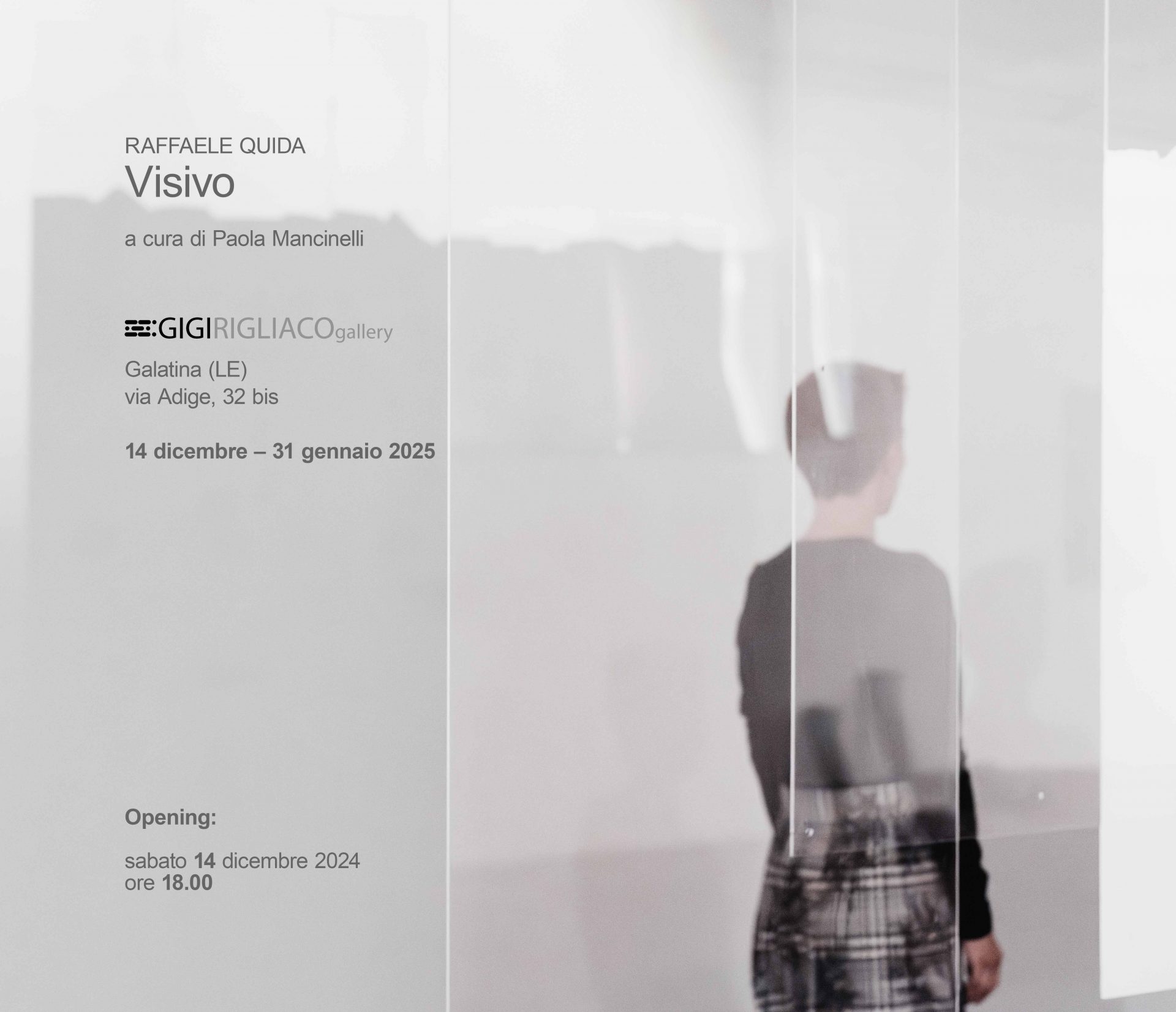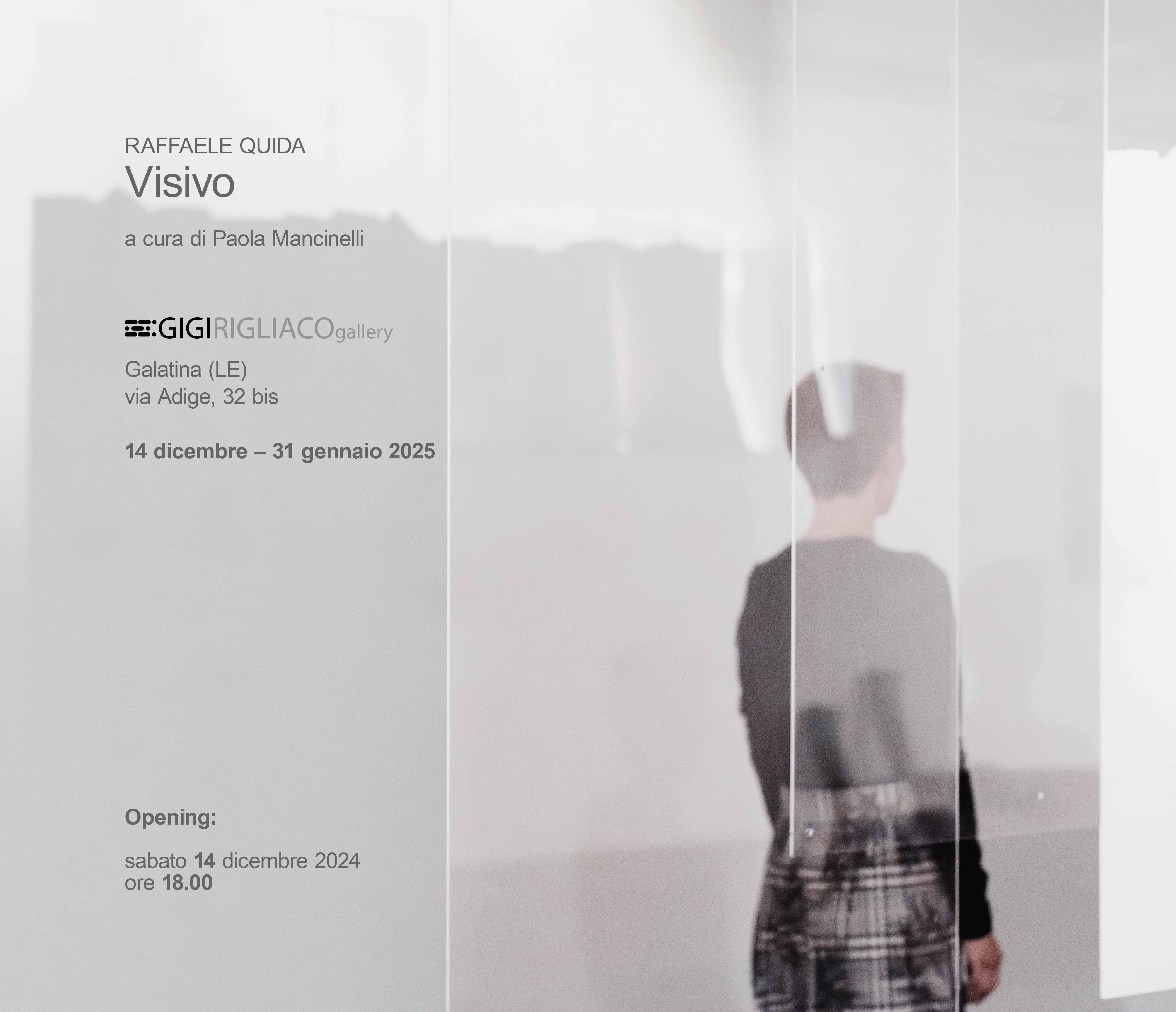"Visivo – Raffaele Quida" alla Gigi Rigliaco Gallery, Via Adige 32 bis, 73013 Galatina (LE) sarà aperta al pubblico fino al 31 gennaio 2025, dal lunedì al sabato dalle ore 10 alle 12.30 e dalle ore 16.30 alle 20 e la domenica su appuntamento al 329 687 2838 | gigirigliacoart@gmail.com