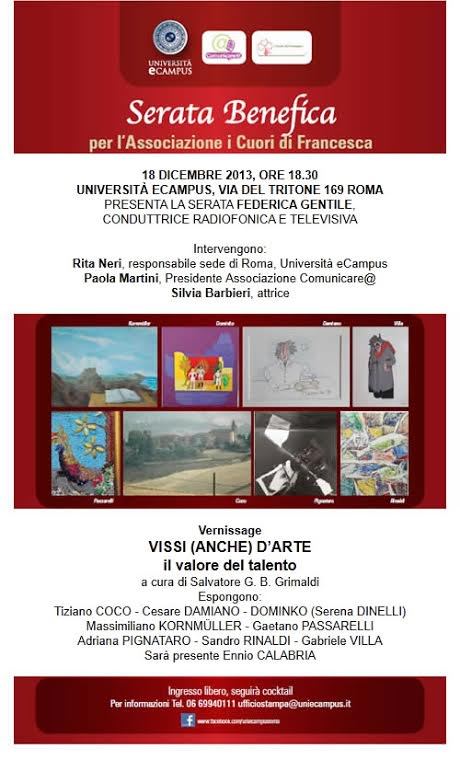 Una serata di solidarietà destinata dall’Ateneo a favore dell’Associazione ‘I cuori di Francesca’, che s’impegna per la tutela di minori resi orfani da femminicidi, in collaborazione con l’Associazione ‘Comunicare@’, animerà la sede eCampus di Roma in via del Tritone 169, mercoledì 18 dicembre, dalle ore 18:30, con la presenza di nomi dello spettacolo, coniugata al vernissage della Mostra ‘Vissi (anche d’Arte)’, a cura di Salvatore G.B. Grimaldi.