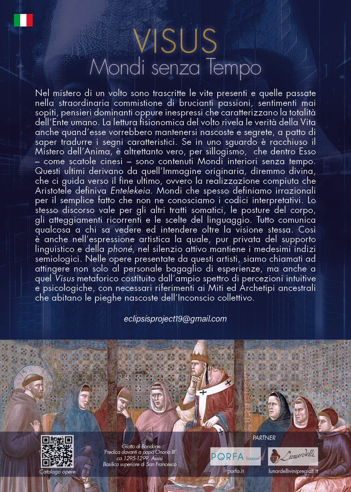Nel mistero di un volto sono trascritte le vite presenti e quelle passate nella straordinaria commistione di brucianti passioni, sentimenti mai sopiti, pensieri dominanti oppure inespressi che caratterizzano la totalità dell'Ente umano. La lettura fisionomica del volto rivela le verità della Vita anche quand'esse vorrebbero mantenersi nascoste e segrete, a patto di saper tradurre i segni caratteristici. Se in uno sguardo è racchiuso il Mistero dell'Anima, è altrettanto vero, per sillogismo, che dentro Esso – come scatole cinesi – sono contenuti Mondi interiori senza tempo. Questi ultimi derivano da quell'Immagine originaria, diremmo divina, che ci guida verso il fine ultimo, ovvero la realizzazione compiuta che Aristotele definiva Entelekeia. Mondi che spesso definiamo irrazionali per il semplice fatto che non ne conosciamo i codici interpretativi. Lo stesso discorso vale per gli altri tratti somatici, le posture del corpo, gli atteggiamenti ricorrenti e le scelte del linguaggio. Tutto comunica qualcosa a chi sa vedere ed intendere oltre la visione stessa. Così è anche nell'espressione artistica la quale, pur privata del supporto linguistico e della phoné, nel silenzio attivo mantiene i medesimi indizi semiologici. Nelle opere presentate da questi artisti, siamo chiamati ad attingere non solo al personale bagaglio di esperienze, ma anche a quel Visus metaforico costituito dall'ampio spettro di percezioni intuitive e psicologiche, con necessari riferimenti ai Miti ed Archetipi ancestrali che abitano le pieghe nascoste dell'Inconscio collettivo.