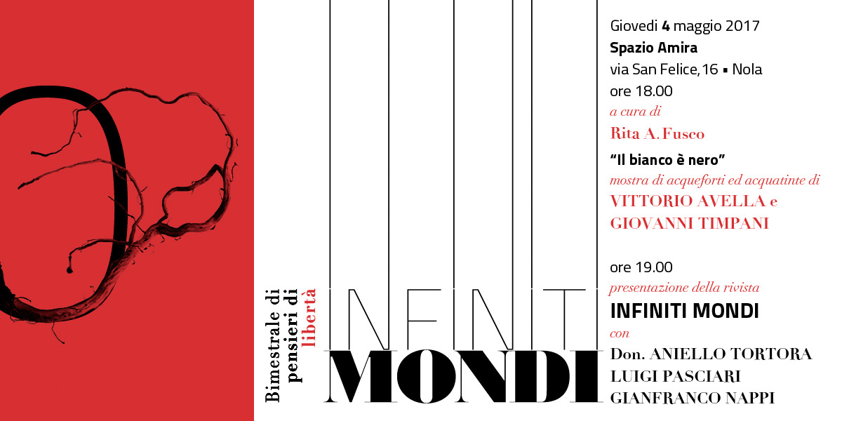 Due generazioni a confronto di incisori. Il Maestro Vittorio Avella incontra Giovanni Timpani, in una doppia personale, di acqueforti e acquatinte. La mostra farà da cornice anche alla presentazione letteraria della rivista “Infiniti Mondi”, a cura di Gianfranco Nappi, suo direttore editoriale.
