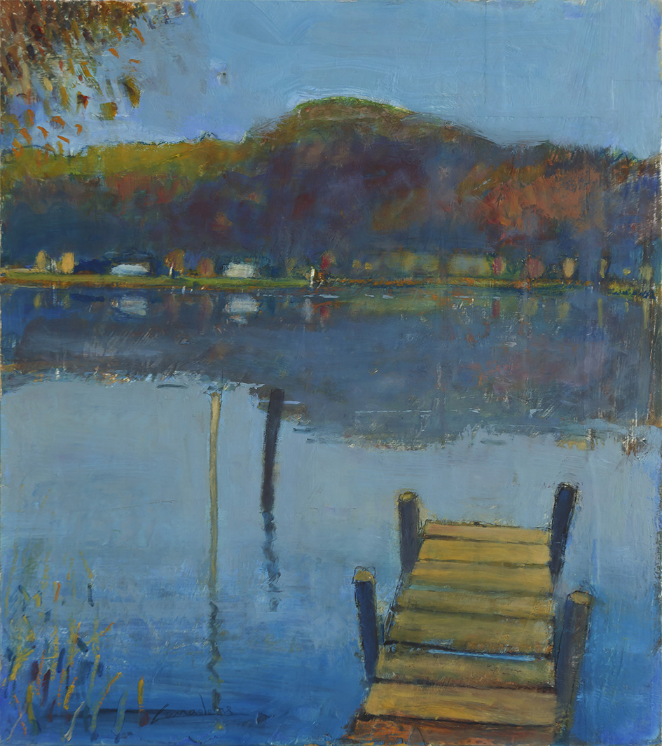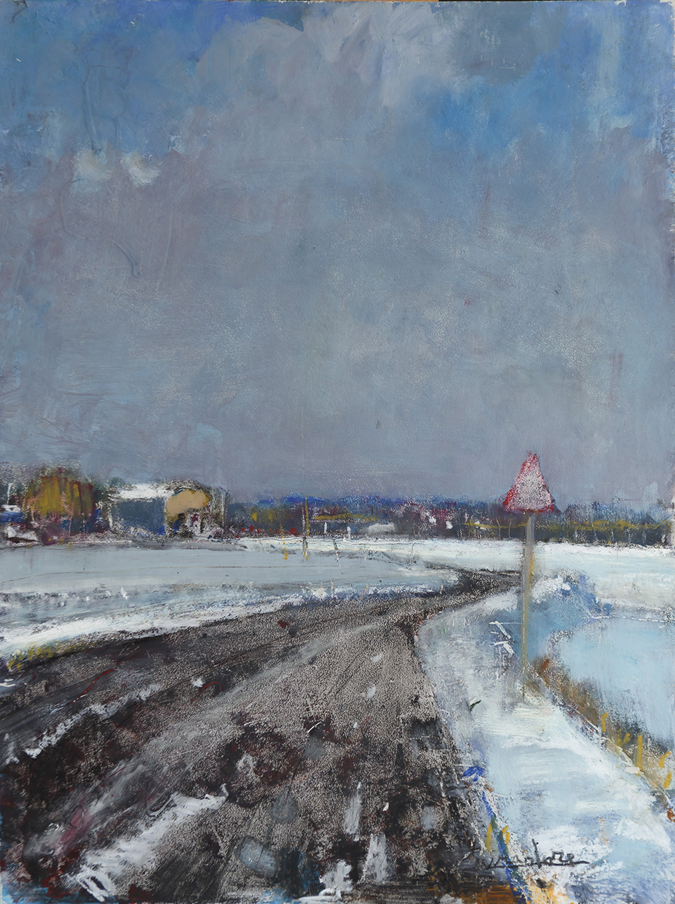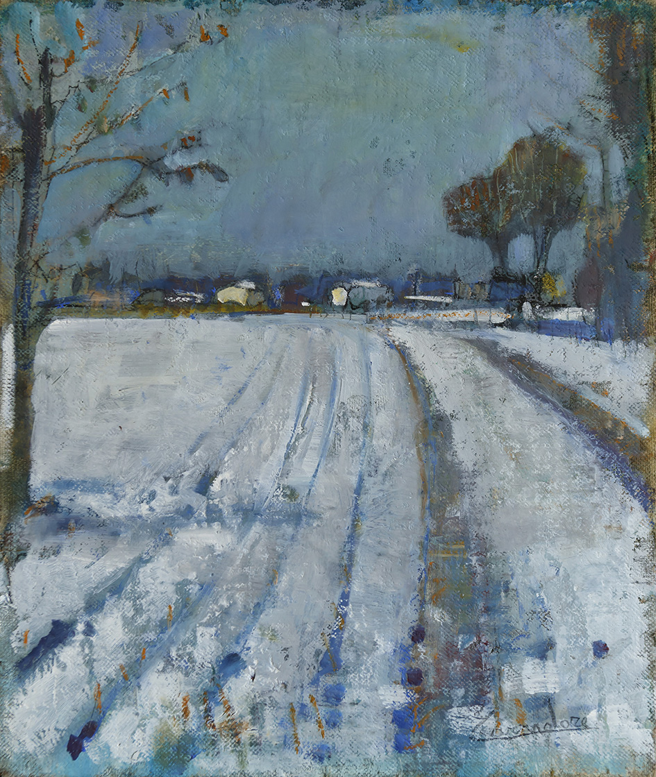 “(…) È il paesaggio che da sempre tiene banco nella pittura di Vittorio Carradore con i suoi accenti luminosi e il cielo tessuto di azzurri, cavalcato a volte dalla nube a volte sopraffatto dalla nebbia. O dalla calura amazzonica dell’umidità estiva. E poi la neve, con la tavolozza infinita dei bianchi, che bianca non è mai, una neve sorprendentemente azzurra, cinerina e attraversata da qualche rosa che fa capolino senza saperne il perché.