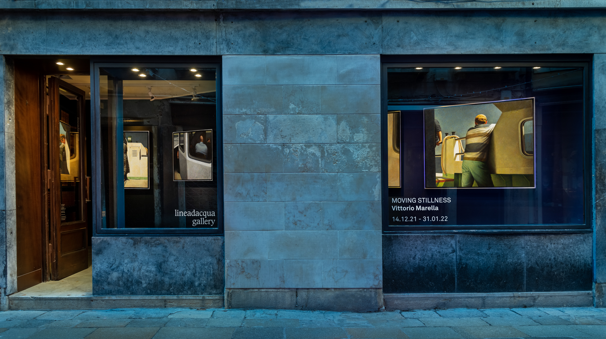 Lineadacqua Gallery ospita la prima personale veneziana di Vittorio Marella. La mostra presenta sette oli su tela, in cui vengono rappresentati fotogrammi di un mondo sospeso tra realtà e sogno, lontani da qualsiasi rappresentazione romantica e olografica di Venezia.