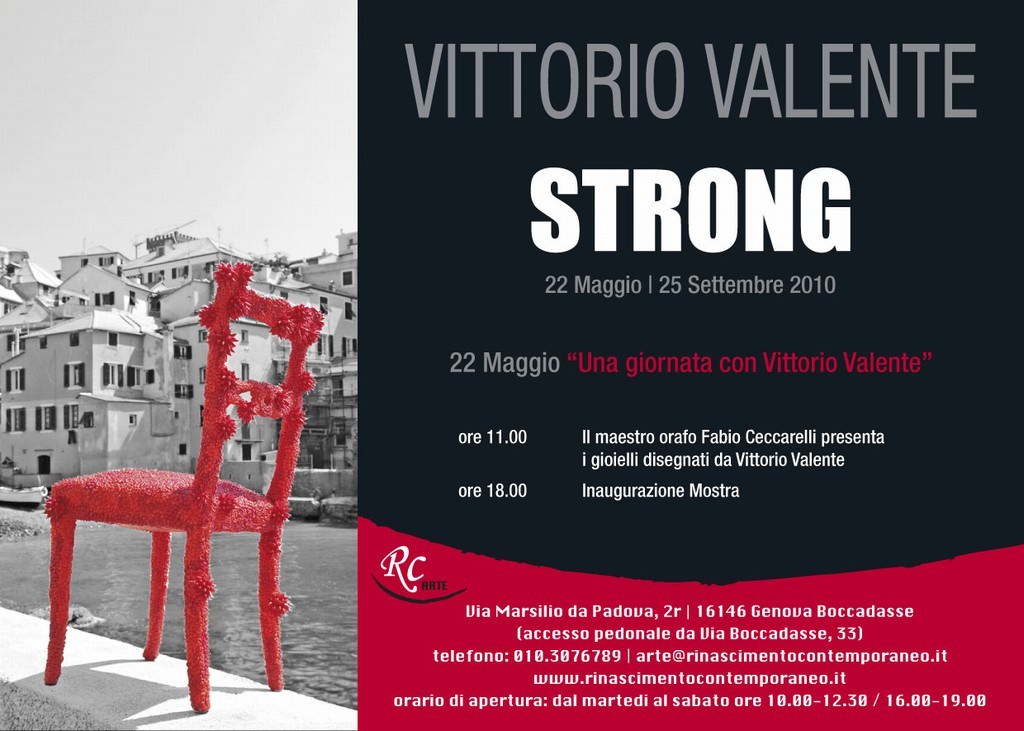 Sabato 22 Maggio 2010, dalle ore 11 in poi, presso la galleria d’arte Rinascimento Contemporaneo. Uno spazio per l’arte di Boccadasse (Via Marsilio da Padova 2 rosso, tel. 010 3076789; Internet: www.rinascimentocontemporaneo.it), si svolgerà una giornata di eventi dedicati al grande artista Vittorio Valente. Le due galleriste Laura Moretti ed Elisabetta Rossetti (nella foto con Valente) hanno messo a punto due interessanti iniziative per celebrare l’artista, loro ospite in galleria con le sue opere sino al prossimo Sabato 25 Settembre 2010. Alle ore 11, il maestro orafo Fabio Ceccarelli presenterà i gioielli disegnati da Valente, in oro, argento e silicone; quindi, alle 18, apertura di “Strong”, la mostra dedicata alle opere dello stesso Valente, artista le cui quotazioni sono in ascesa: quadri, disegni, oggetti, sedie e statue. Valente è noto, nell’ambito della storia dell’arte contemporanea, per essere stato il primo a portare il colore sulla tela attraverso l’utilizzo del silicone industriale. Durante l’inaugurazione, la fotografa professionista Cristina Corti ritrarrà con il proprio obiettivo chi si metterà a sedere sulla famosa Sedia rossa in silicone (foto) di Valente, il simbolo di tutta la mostra. L’orario di apertura della galleria è dal Martedì al Sabato dalle 10 alle 12,30 e dalle 16 alle 19. «La ricerca di Valente - si legge nel saggio critico di Maura Iob - esige di rielaborare i valori plastici e cromatici attraverso una nuova sostanza, il silicone. La siringa è lo strumento artistico necessario a ottenere immagini formate da centinaia di punti e di tratti giustapposti con meticolosa pazienza. Le capacità di Valente risiedono anche nella sua abilità manuale. Nel controllo del materiale scelto, nel bisogno di supportare la propria ricerca artistica da un lavoro artigianale attraverso cui percepire la fatica fisica che tradizionalmente è attribuita al lavoro scultoreo. Nel 1987 inizia a utilizzare il silicone con la siringa al fine di ottenere quel modulo a goccia che caratterizza tutto il suo percorso artistico». Nel 1993 è uno dei fondatori del movimento Cracking Art, che cerca di superare le apparenti antinomie tra artificiale/naturale, bello/brutto, come la plastica deriva dal petrolio, il silicone viene estratto dalla sabbia per sintesi chimica. Il silicone è un materiale che permette un linguaggio nuovo ma con dei limiti espressivi, superati da Valente attraverso una continua e instancabile ricerca che lo ha condotto fino agli ultimi lavori su tela, in cui il movimento delle forme e dei piani tono su tono ricordano opere optical. «Le sue opere - prosegue Maura Iob - sono pitto-sculture; Valente modella forme plastiche tridimensionali anche quando sceglie la tela come supporto, trasformandola in un altorilievo solo apparentemente duro e aguzzo. Le sue opere esigono un approccio multisensoriale; le superfici dermatiche non rifiutano di essere toccate, accarezzate, provocando l’attitudine a un approccio multisensoriale del reale. Unendo al materiale artificiale colori ad olio ottiene nuove tonalità cromatiche che lo portano, nelle opere più recenti, a soluzioni monocromatiche: rosso, giallo e gli assoluti bianco e nero».