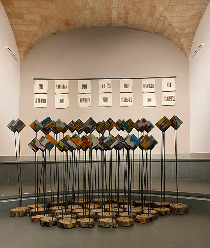 E ancora di ceramica è l’installazione nella prima sala: in basso, su steli di ferro affondati in sezioni di tronchi si ergono fiori stilizzati, decorati con cifre di un misterioso alfabeto memore degli ornamenti calligrafici islamici. In alto, campeggiano sulla parete, come un’emanazione levitante, i moduli quadrati di carta realizzata a mano dall’artista: hanno la consistenza di nuvole luminose con l’anima in ceramica policroma. L’istallazione è un frammento di universo “ricreato” dove posare lo sguardo e riflettere sul senso del fare arte, in particolare in questo difficile momento storico.