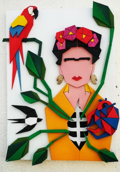 nell’effetto finale: Frida Kalo, la Marilyn, David Bowie, Maria Lai, “Eva”, il “Bacio” di Klimt