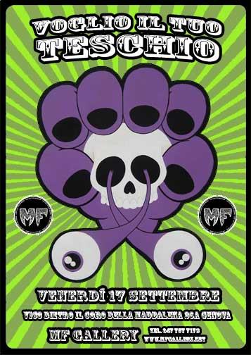 Il teschio umano visto da un gruppo di artisti Americani e Italiani. Underground Pop Art da Genova e New York. Teschi Lowbrow / Pop Surrealisti. Teschi fotorealistici, spaventosi, cartoon, psichedelici, scuri e colorati… Scolpiti, dipinti, a 3 dimensioni, su tela e su carta.