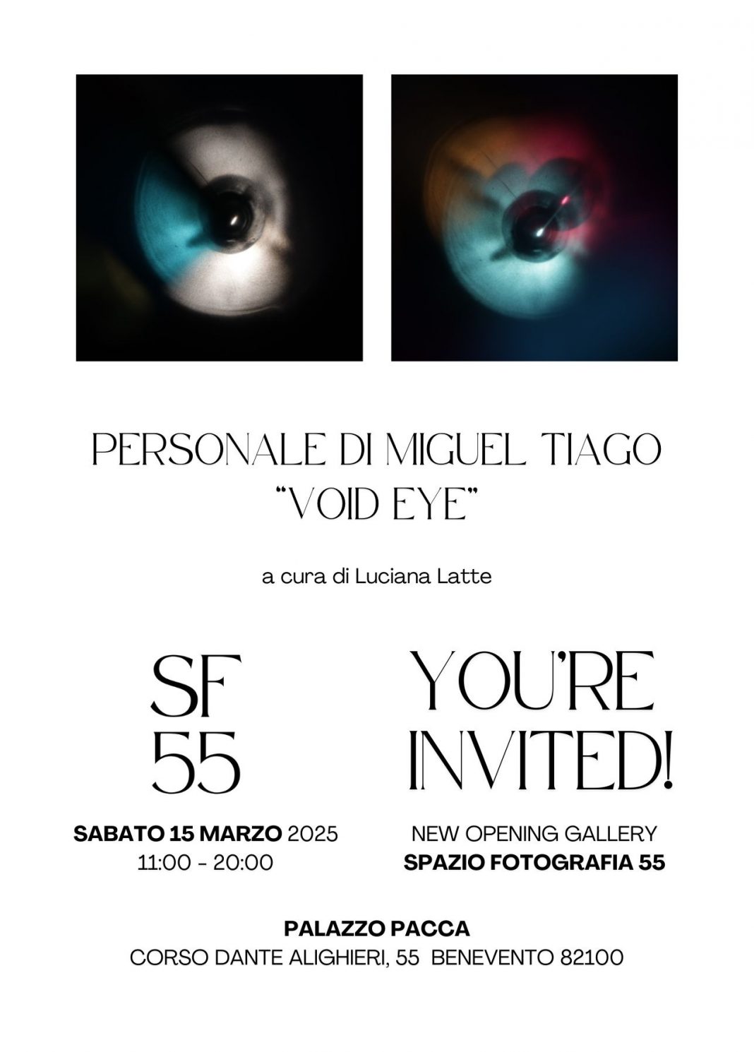 A inaugurare il nuovo spazio sarà la prima personale in Italia del fotografo Miguel Tiago, dal titolo "Void Eye". Un’indagine visiva profonda e concettuale che ruota attorno al ruolo dell’occhio, non solo come organo fondamentale dei sensi, ma come portale tra l’individuo e il mondo attorno.