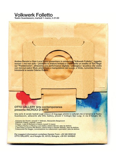 MARTEDÌ 1 marzo alle ore 21:00 presso il Teatro Guardassoni (sito all’interno del Collegio San Luigi ed adiacente alla galleria – via D’Azeglio 55, Bologna), si terrà il secondo incontro nel quale Andrea Renzini e Gian Luca Patini presenteranno in anteprima VOLKWERK FOLLETTO. La performance digitale/analogica/acustica vedrà con loro sul palco Wud, produttore e manipolatore del suono, e Virdo, rumorista ritmico e sarà introdotta da Oderso Rubini.
