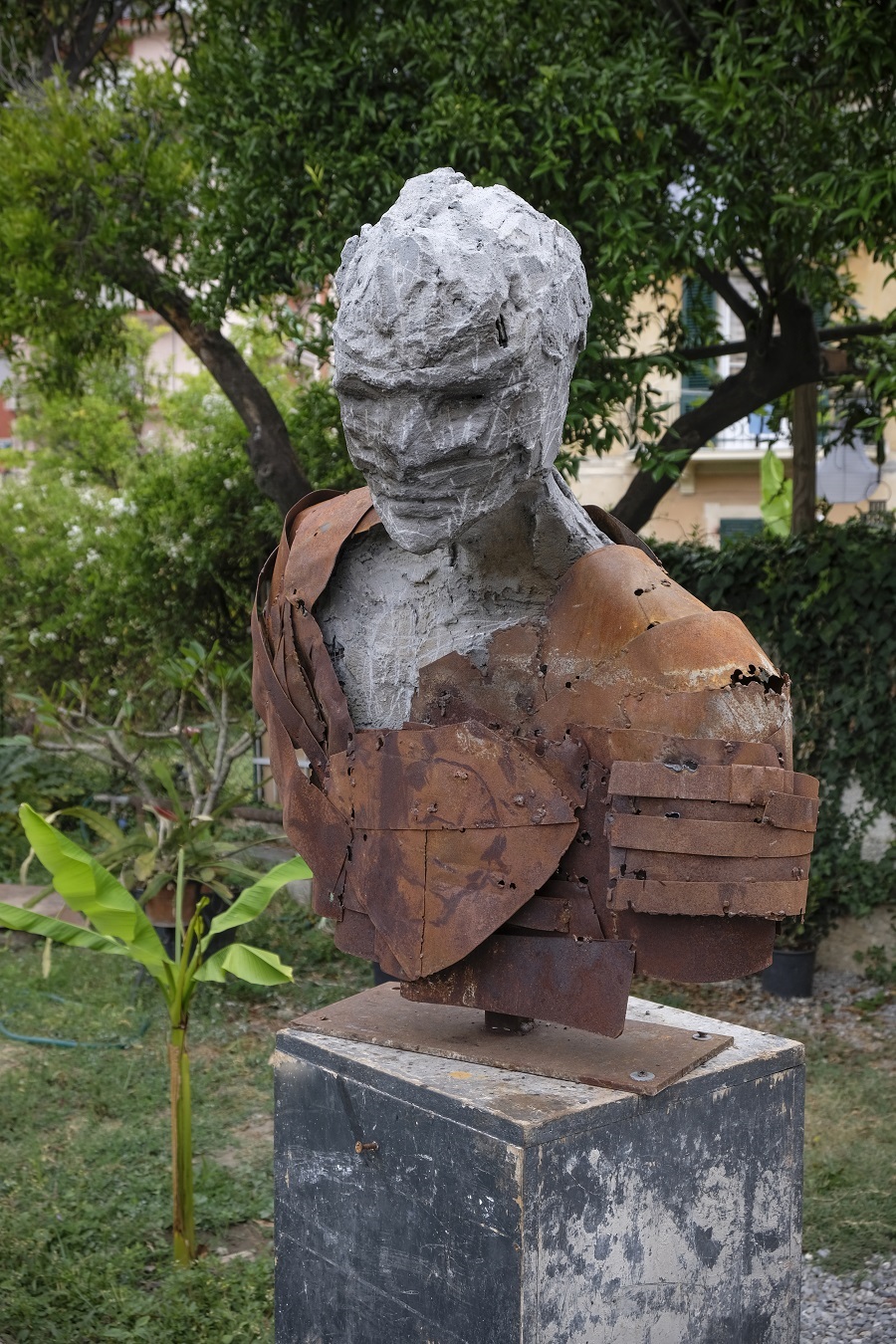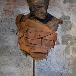 Teste, busti e figure ― modellati con materiali diversi quali cemento, calce, cenere, ferro e gesso alabastrino appaiono feriti, scheggiati, segnati, macchiati; come fossero stati modificati dal passaggio del tempo, dalla sua erosione naturale e l’abbraccio del ferro arrugginito al cemento, può diventare corazza che protegge o gabbia dalla quale fuggire.