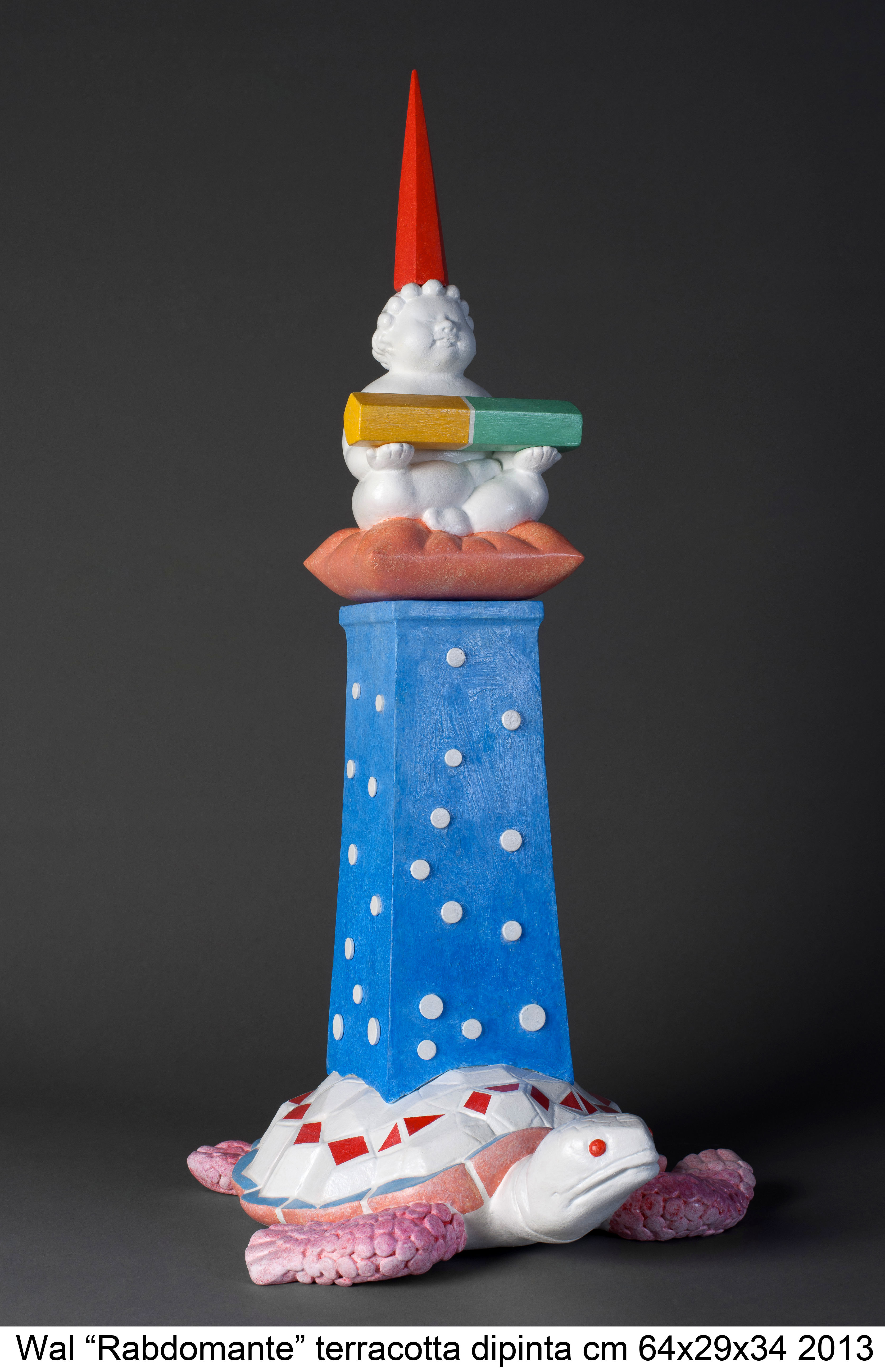 Una selezione di sculture, dipinti e disegni che caratterizzano la sua ricerca dagli anni Ottanta a oggi; dalle prove in ambito fumettistico che sfociano nell’adesione al gruppo dei “Nuovi-nuovi” di Renato Barilli, ai futuristici vortici delle “api”, un turbine di gesti e di segni che si placheranno nell’astrazione geometrica che dal 1987 va a occupare il corpo stilizzato di animali ritagliati nel legno. Mentre a partire dal 1990 avviene l’ultima e decisiva rivoluzione creativa: entra in scena quel “putto” che diventa il protagonista assoluto delle sue opere e che conquista il ruolo principale nell’attuale esposizione. Afferma in proposito Renato Barilli: “Wal trova che è giunta l’ora di dare corda, anzi fiato, aria a quel protagonista capriccioso e imperioso che lo assedia fin dall’inizio, anche se finora non si è mai mostrato allo scoperto: un putto pretenzioso, irriverente, malizioso, ma nello stesso tempo tanto dolce e paffutello come si conviene a ogni bambino”.