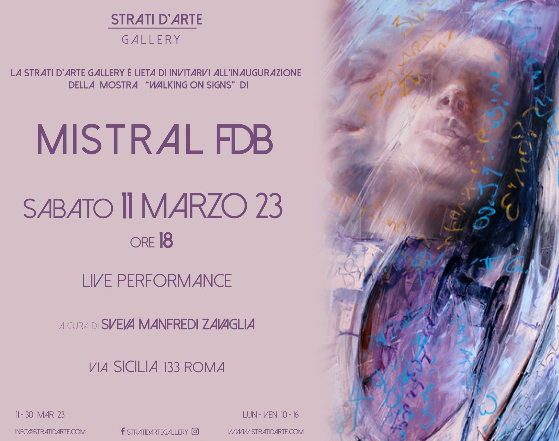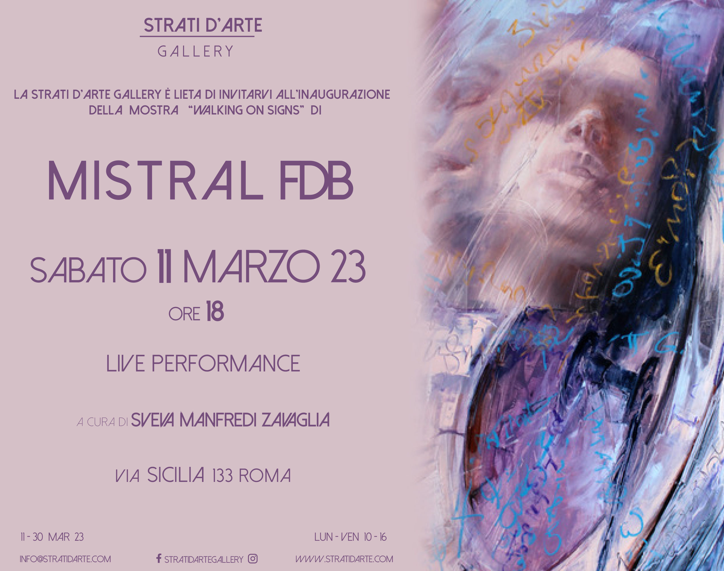 Apre a Roma, sabato 11 marzo 2023 alle ore 18, presso la Strati d’Arte Gallery, la mostra personale “Walking on Signs” di Mistral FDB, a cura di Sveva Manfredi Zavaglia, fino al 30 marzo 2023.
