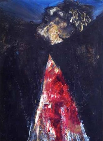 E ferisce, letteralmente, in uno squarcio fatale, nell’olio dedicato a Il mantello: un Buzzati riletto nel suo accento più cupo, di una dolenza terribile e definitiva, insinuante e satura.