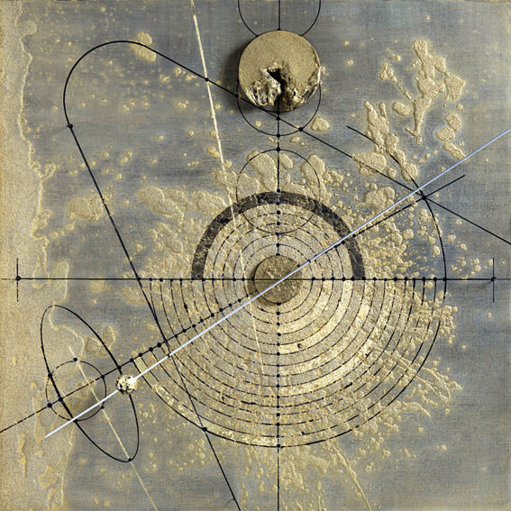 Acqueforti, dipinti, installazioni, libri d’artista sono le tessere che compongono un lungo, coerente percorso, mirato a sondare le categorie dello spazio e del tempo. L’artista cerca, nell’ eterna mutevolezza della realtà, di andare oltre le apparenze, di cogliere e fissare sul foglio, sulla tavola, sul muro arcane, armoniche geometrie, parvenze metafisiche di un’utopica perfezione. Lo spazio in cui si muove è quello della terra e del cielo, dove traccia elissi, cerchi, archi, affascinanti traiettorie, una magica cosmografia riflesso di un universo interiore. Il tempo è il terribile Crono, che logora le superfici, rende tutto transitorio, deperibile: con lui l’artista dialoga, cerca momentanee soluzioni, torna a porsi il grande Mistero. E’ il tempo misurato attraverso la gnomonica, con arcaiche meridiane e pendoli; il tempo come memoria storico-artistica – con le forti suggestioni umanistico-rinascimentali – e come memoria personale, legato ai ricordi dell’infanzia.