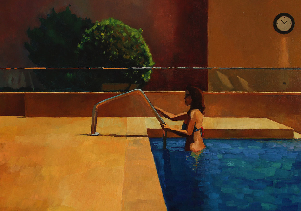 L’estate di Iskra Shahaj, albanese di nascita, ferrarese di adozione e che oggi vive ad Abu Dhabi, è influenzata dai colori del mediterraneo e del deserto che sviluppano in lei immaginazione e creatività. Nelle opere dell’artista non c'è narrazione, si tratta di un attimo catturato durante la giornata. Per questo motivo i quadri non hanno un titolo ma solo un numero che li identifica. Le sue tele hanno come tema ricorrente la solitudine, intesa come un momento di raccoglimento con se stessi. La protagonista della scena è sempre una donna ma il suo interesse è rivolto principalmente al gioco di luce e colore che si crea nelle pieghe dei suoi vestiti.