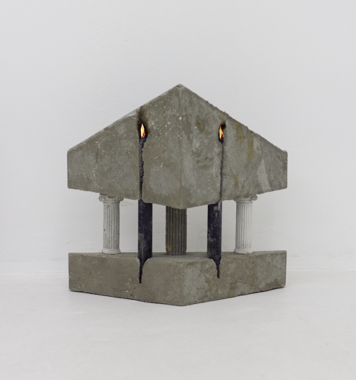 piccole edicole in cemento grigio, che richiamano reliquiari o totem, rappresentando una connessione tangibile con la