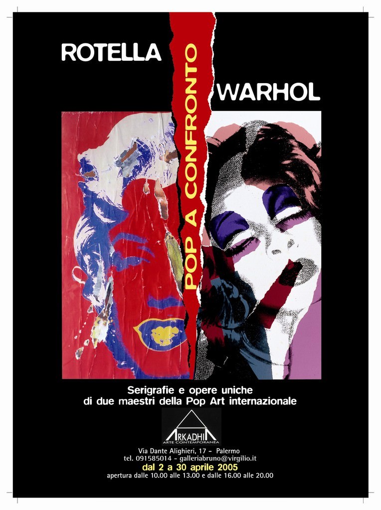 In un clima di rinato interesse per la pop art, la galleria Arkadhia, in via Dante 17 a Palermo, pone a confronto due grandi rappresentanti del movimento pop internazionale: Andy Warhol, il cui mito non accenna a tramontare a distanza di quasi vent’anni dalla sua morte, e Mimmo Rotella, il padre del décollage, il manifesto pubblicitario lacerato che è entrato a far parte dell’immaginario collettivo come le Marilyn di Warhol. Attivo più che mai, Mimmo Rotella (nato a Catanzaro nel 1918), unico esponente italiano del Nouveau réalisme, espone nei musei di tutto il mondo, mentre le sue opere sono contese nelle aste internazionali.
