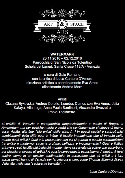 L’associazione culturale Art Space arriva a Venezia, proponendo un nuovo progetto che avrà sede in uno dei più bei luoghi della città. Legandosi con il capolavoro del poeta russo “Fondamenta degli incurabili” prende da esso spunto per il titolo della mostra: Watermark.