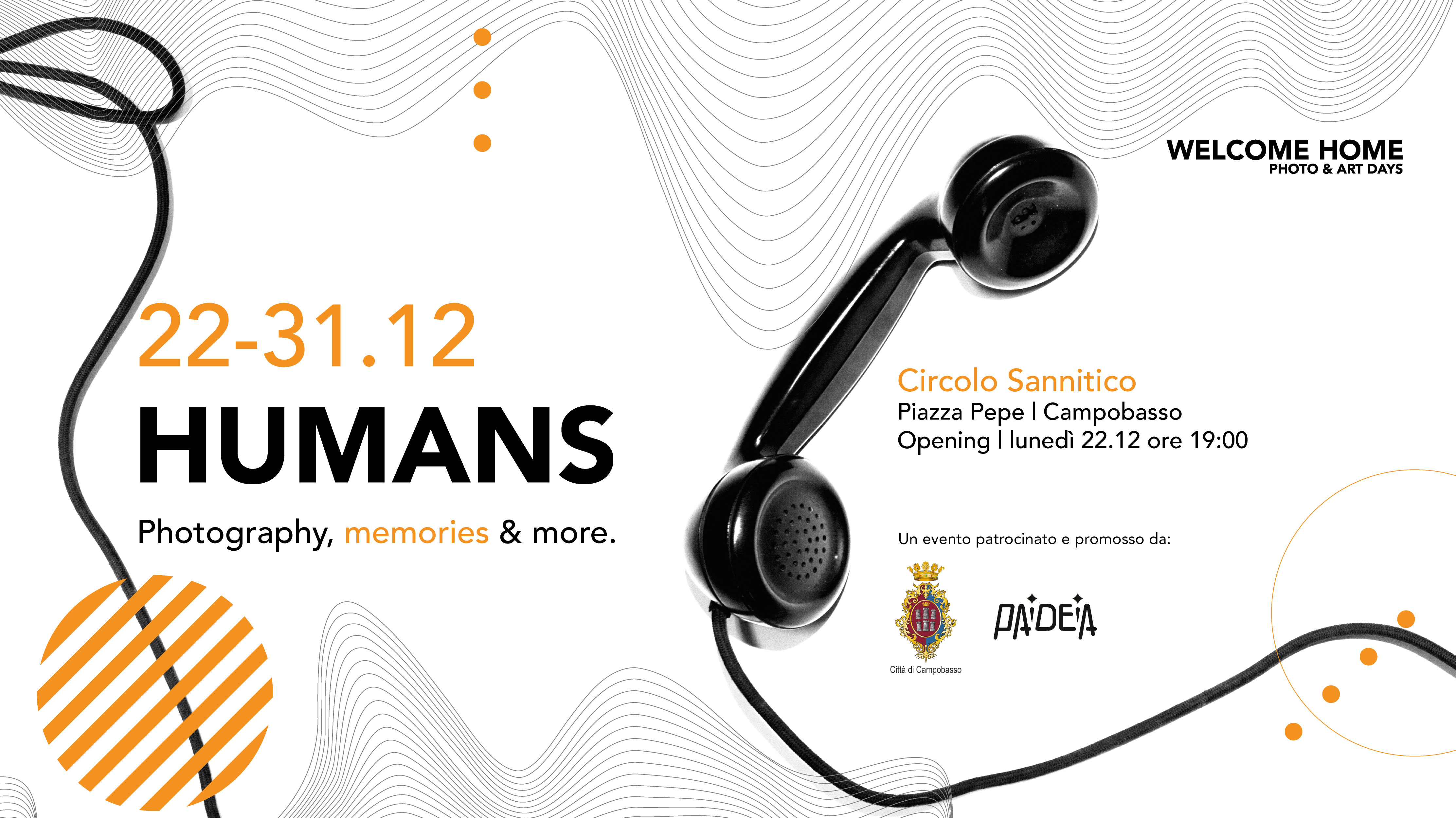 “Welcome Home – Photo & Art Days” èun evento dedicato alla fotografia e alle arti contemporanee. L’installazione immersiva “Humans” è percorso visivo ed emozionale che affronta con delicatezza e profondità i temi della mancanza, dell’assenza e del ricordo, attraverso foto e video.