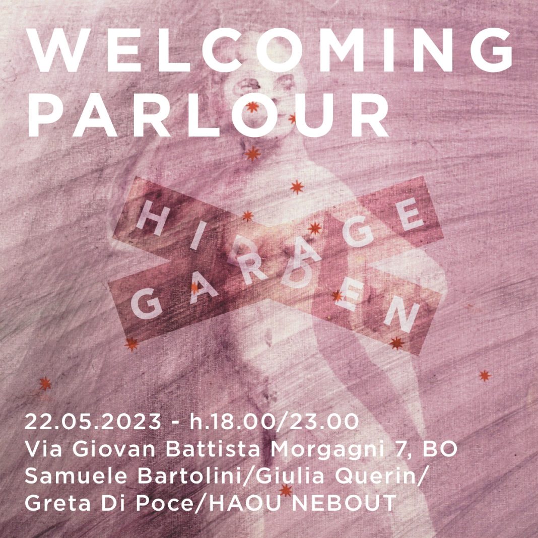 Lo spazio espositivo indipendente Hidden Garage presenta Lunedì 22 Maggio WELCOMING PARLOUR, presso la nuova sede in Via Giovanni Battista Morgagni 7/E, evento eclettico e polimorfo che vede come protagoniste le opere di Samuele Bartolini, Giulia Querin, Greta Di Poce e il trio dei sound performer HAOU NEBOUT composto da Riccardo Tesorini, Andrea Fabris e Biagio Cavallo che, insieme alle opere di Greta daranno vita ad un’esperienza sensorialmente amplificata.