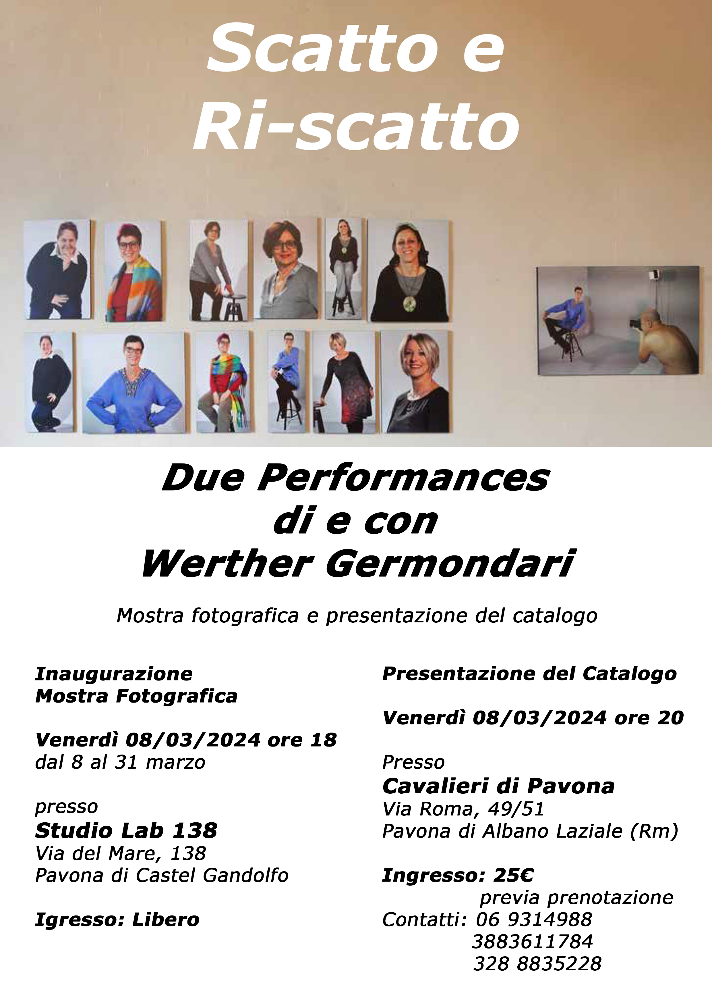 La mostra fotografica e il catalogo raccolgono i ritratti realizzati da Werther Germondari nel 2021 e 2022 in occasione delle performance realizzate presso lo spazio espositivo e studio fotografico di Pavona di Castel Gandolfo Studio Lab 138.