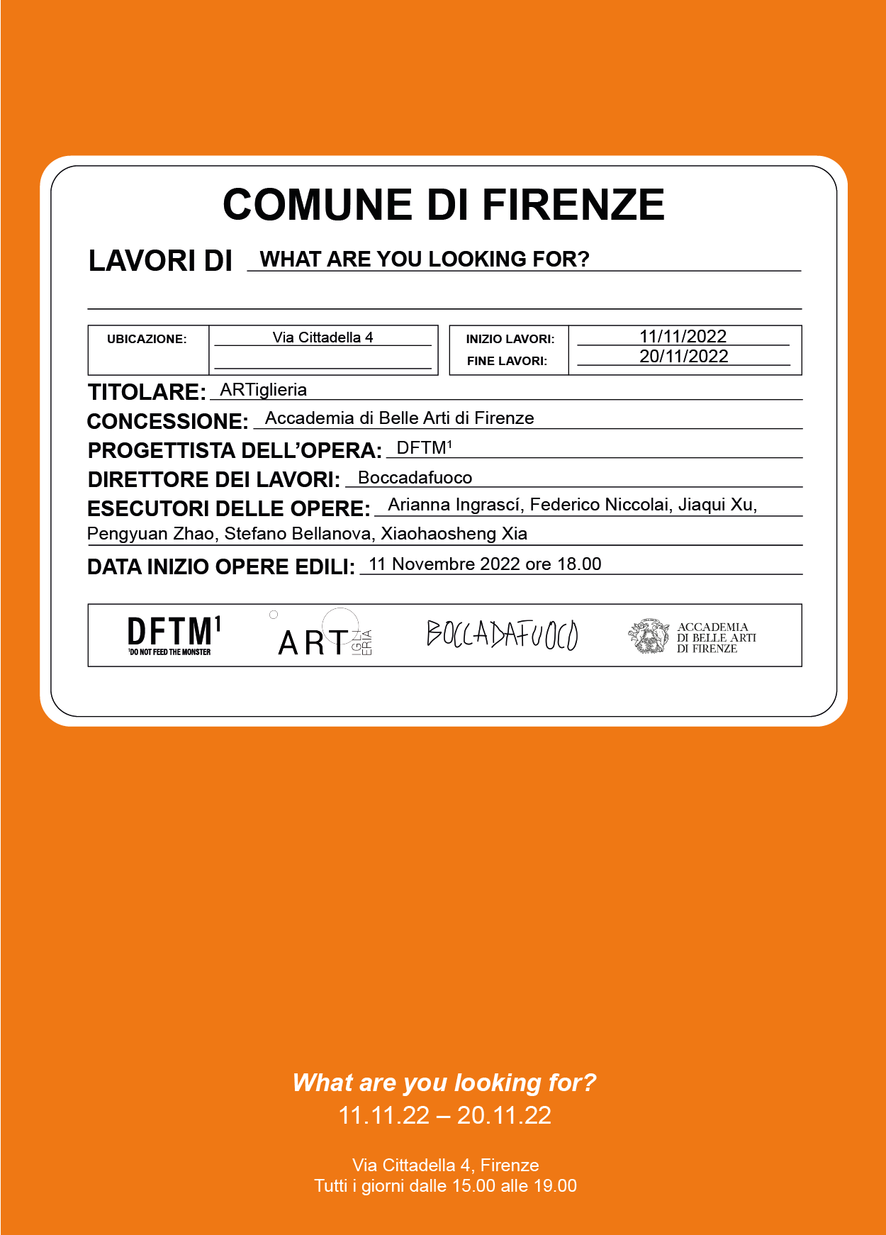 “What are you looking for?” a cura di DFTM1, gruppo autogestito di studenti dell’Accademia di Belle Arti di Firenze in collaborazione con la Consulta degli studenti e ospitato dall’associazione culturale ARTiglieria, si colloca nell’ambito dei progetti educativi di BOCCADAFUOCO.