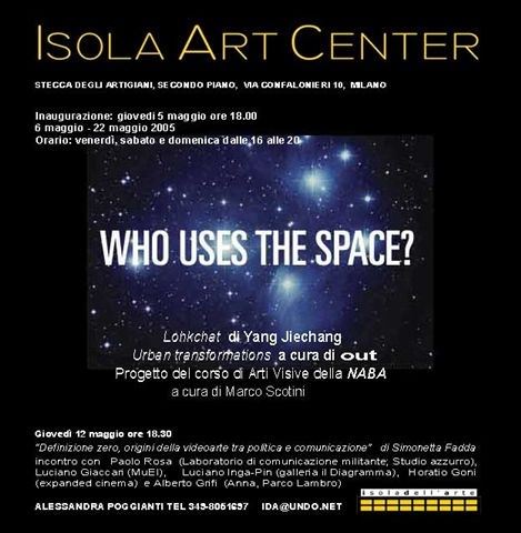 Il progetto Who uses the space? concepito per una struttura artistica alternativa come Isola Art Center vuole essere una riflessione sulle condizioni che assoggettano lo spazio, lo regolano, lo disciplinano e, allo stesso tempo, lo producono. Tra lo spazio della rappresentazione (quadro, installazione, video o altro), quello del museo e quello della città intercorre una stessa relazione ordinatrice oppure queste dimensioni di attività spaziali sono tra loro indipendenti? Quando nel 1975 Marcel Broodthaers pubblica un piccolo libro, La conquête de l’espace: Atlas à l’usage des artistes et des militaires (The Conquest of Space: Atlas for the Use of Artists and the Military) dà una risposta definitiva al problema. L’atlante è un sottile volume che contiene le mappe sagomate delle nazioni riprodotte tutte nello stesso formato, una per pagina. Broodthaers più di ogni altro ha insidiato la pretesa neutralità dell’istituzione museale facendola diventare di volta in volta - nella fiction del suo Musée d’Art Moderne - un luogo d’interdizione ai bambini (Museum enfants non admis), il display di ruoli amministrativi geometrizzati (a rectangular director), una tipologia di polizia spaziale, etc. La domanda Who uses the space? viene ora posta da un gruppo di giovani artisti alla loro prima esperienza espositiva, o quasi. Rispetto ad altre generazioni precedenti, quella attuale non si interroga più sull’essenza dell’arte ma sul suo carattere storico-culturale e funzionale. Il grado zero non è la tela bianca o “il disegno geometrico” ma la domanda radicale su “come” e “chi” produce lo spazio. E lo spazio è quello di vita contro quello dell’economia, lo spazio comune, lo spazio disegnato dalle differenze, lo spazio dell’esclusione, lo spazio di negoziazione, quello dell’integrazione e, soprattutto, quello trasformativo della migrazione. In questo senso, intervenire entro un contenitore d’azione e di auto-rappresentazione come è Isola Art Center è già una direzione operativa, una scelta di campo. Willem Sandberg diceva che in un museo si dovrebbe avere la sensazione di poter giocare a ping-pong. Oggi lo pensiamo come un luogo aperto di interazione e mobilitazione: soprattutto come uno spazio, tra gli altri, della trasformazione. Il progetto nato all’interno del corso di Arti Visive della Nuova accademia di Bella Arti di Milano (NABA) e curato da Marco Scotini coinvolge alcuni studenti dei corsi di Marcello Maloberti, Stefano Boccalini, Antonella Bruzzese (Gruppo A12), Dimitris Kozaris. Partecipano: Antonio Barletta, Malin Baumann, Marco Bongiorni, Valentina Brenna, Lisa Chiari, Tommaso Garner, Magne Ilsaas, Noga Inbar, Cristina Mariani, Alberto Montorfano, Halldor Sturluson, Vanessa Tagliabue, Lorenzo Tamai, Ian Tweedy, Lorenzo Zelaschi