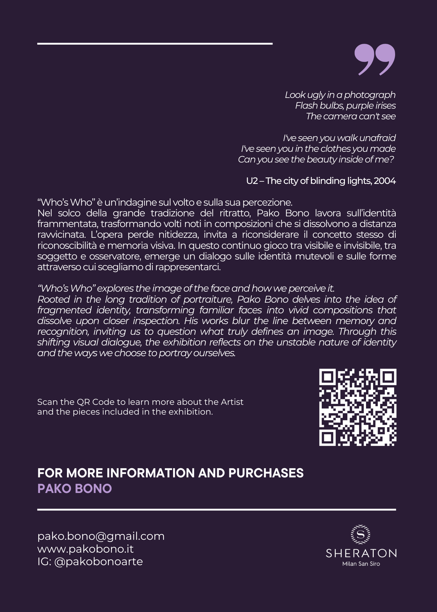 La mostra, intitolata “Who’s Who”, si concentra sul tema del ritratto contemporaneo, giocando sulla riconoscibilità dei soggetti noti e sull’ambiguità dell’identità. Attraverso una fusione tra pittura e fotografia, Bono scompone e rielabora i volti simbolici del nostro tempo, trasformandoli in opere
