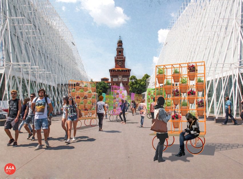E’ un giardino pubblico su ruote che appare nella piazza di Expo Gate all’alba di lunedì 13 aprile e, come in una performance, si completa di piante e fiori nel corso della mattinata.