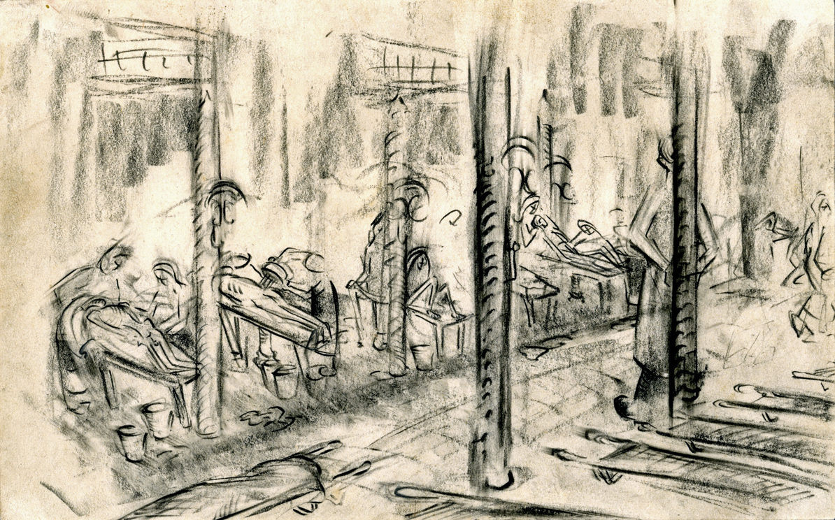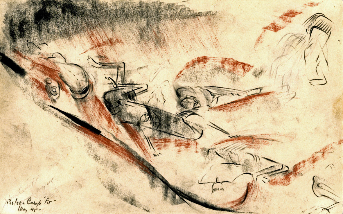 Tra la fine dell’aprile e la fine del maggio del 1945, infatti, William Congdon lavorò al recupero dei sopravvissuti del campo di concentramento di Bergen Belsen, assistendo in prima persona all’indicibile orrore dell’Olocausto: un’esperienza che lo segnò tanto in profondità da essere determinante nella sua decisione di dedicarsi alla pittura. Ai volti che vide Congdon tentò di dare una forma attraverso testi e schizzi raccolti in un diario, in seguito rielaborato in un dattiloscritto dal titolo “In the Death of One”, una sorta di memoriale delle sue campagne militari, che culminava, nell’ultima parte, in una serie di descrizioni di momenti e figure particolarmente strazianti del Campo di Belsen. Il testo, che rappresenta una preziosissima e rara documentazione dell’impatto che questo fenomeno inaudito ebbe sui primi soccorritori, e che l’artista avrebbe voluto vedere pubblicato insieme ai numerosi disegni eseguiti sul posto, rimase di fatto inedito, e lo è tutt’oggi, salvo alcune sezioni pubblicate di recente sulla rivista “Italian Poetry” della Columbia University.