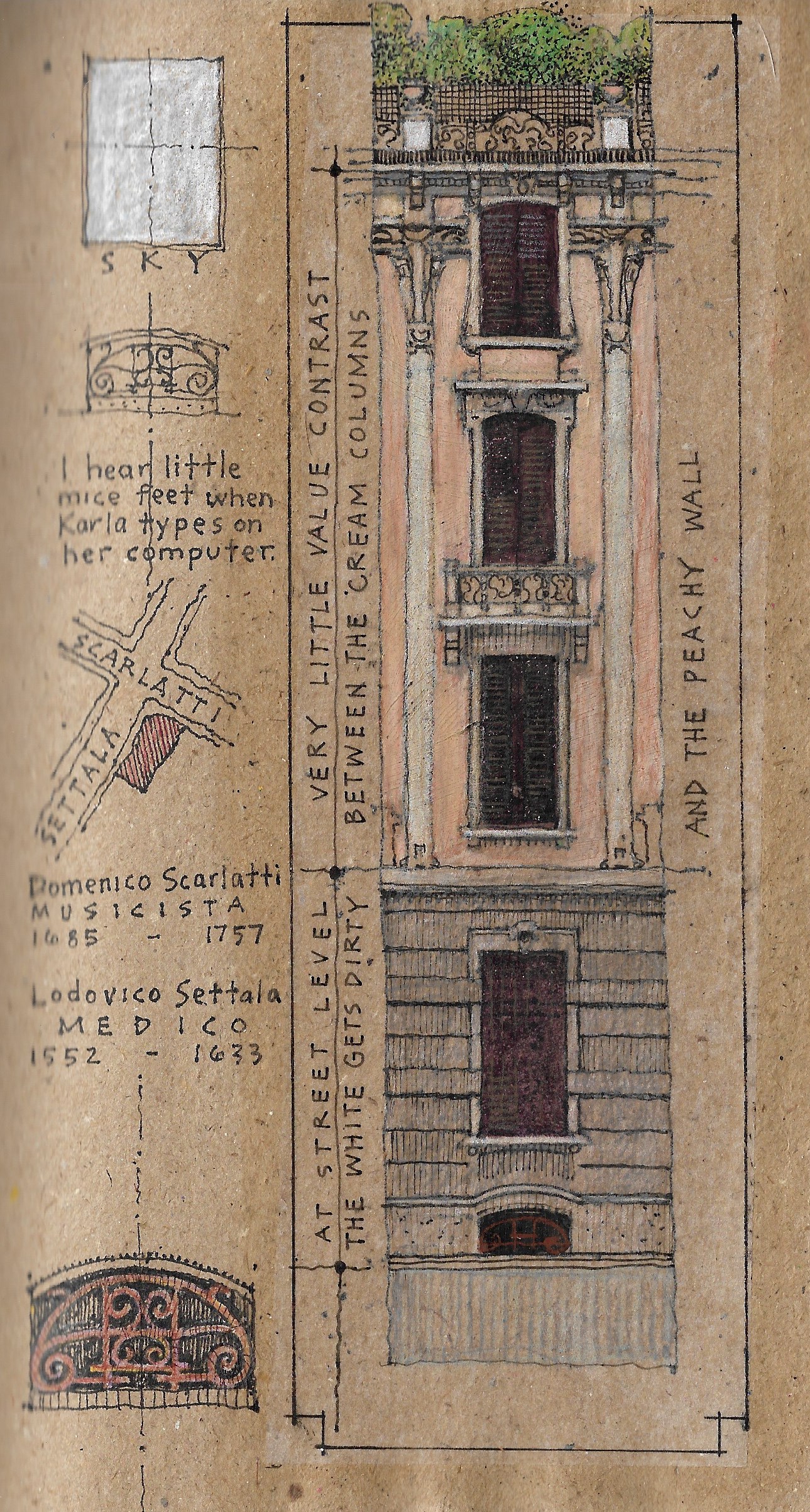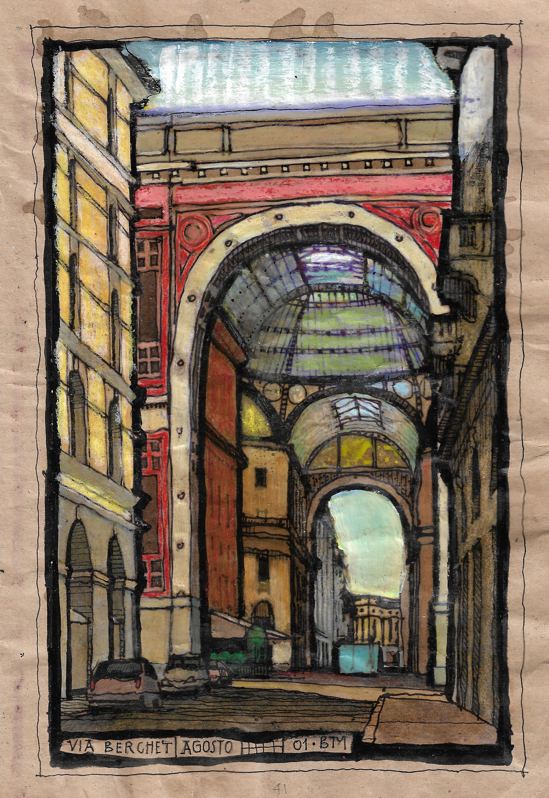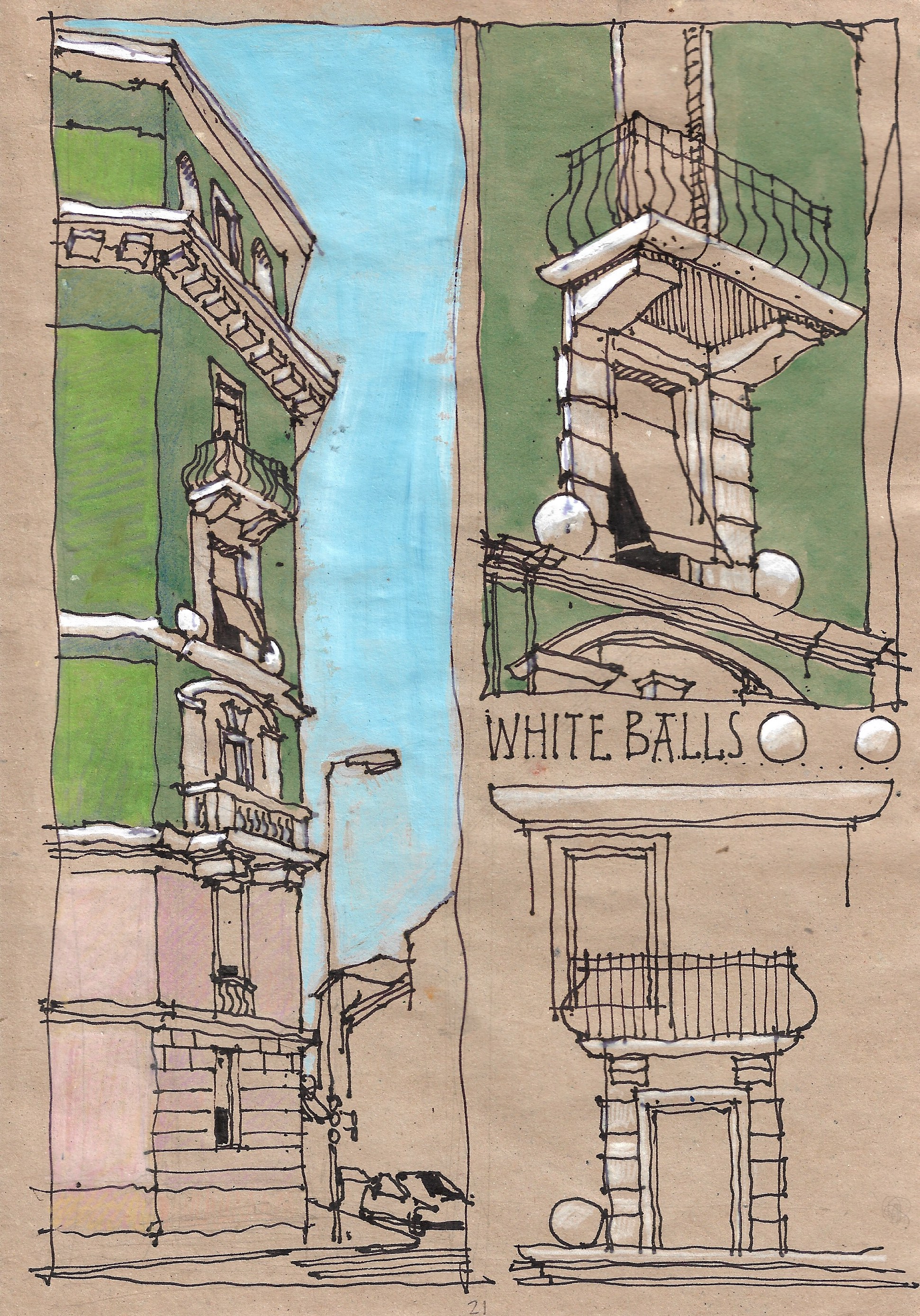 There are many reasons to appreciate the graphic work of this gentle and surreal artist. We could refer, first of all, to the technical skill that distinguishes his urban architectural designs which, inspired by the architectural elevations of the eighteenth and nineteenth centuries, are often enriched with studies of decorative details. These are not simple architectural sketches, but real mental maps of Bill's digressions "by analogy", where situations, stories, visions and micro-narratives are juxtaposed and contrasted. Often, in the same drawing, different subjects coexist in a delicately ironic way, capable of arousing in the observer a sense of surprise and estrangement at the same time.