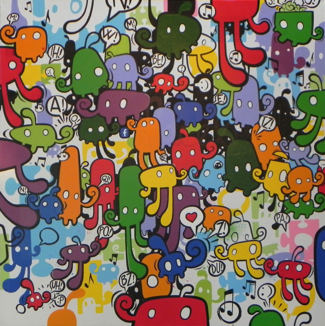 Spicchi di gelatina colorata, i piccoli personaggi sono come una cascata di canditi dalle tonalità accese, hanno umori incandescenti. Gialli, rossi, arancioni, blu, azzurri, verdi e viola, una parata festosa e caramellata corredata da una forte impronta onomatopeica tipica del fumetto, “UOP”, “B”, “PA”, “PE”, “HI”, “EB”, “Z”, “:D”, “SBU”, “LA”... sembra quasi di sentirli goffamente.