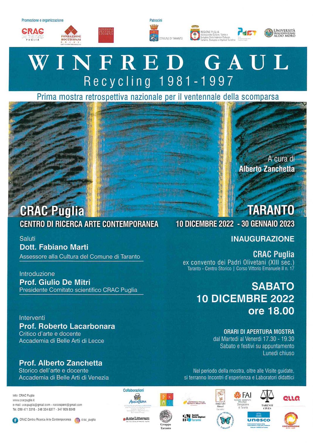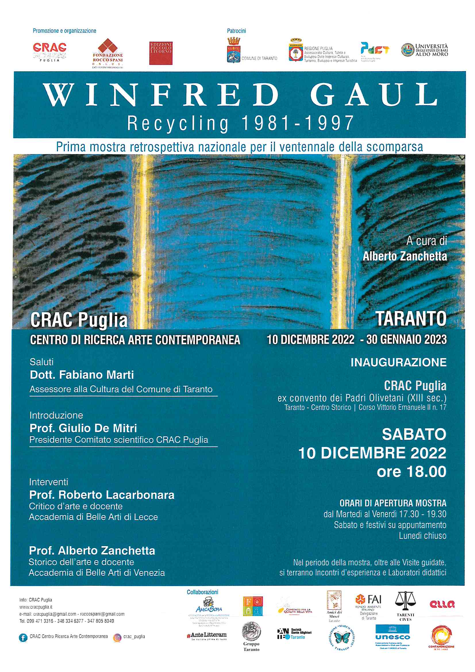 Sabato 10 dicembre p.v. alle ore 18.00 al CRAC Puglia (Centro di Ricerca Arte Contemporanea) della Fondazione Rocco Spani Onlus avrà luogo l'inaugurazione della mostra retrospettiva del celebre maestro Winfred Gaul (Düsseldorf, 1928 - Kaiserswerth, 2003) a cura di Alberto Zanchetta.