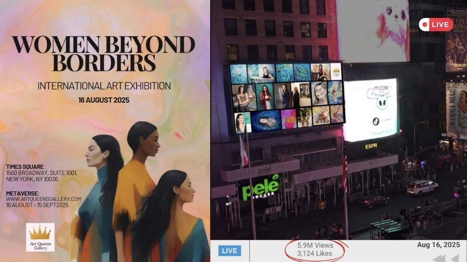 New York, August 2025 — Over 6 million global viewers tuned in via EarthCam as Times Square became the stage for Women Beyond Borders, an international exhibition curated by Art Queens Gallery. For 24 hours, six visionary women artists transformed the world’s most iconic square into an open-air gallery, redefining the boundaries of where art can exist and who it can reach.