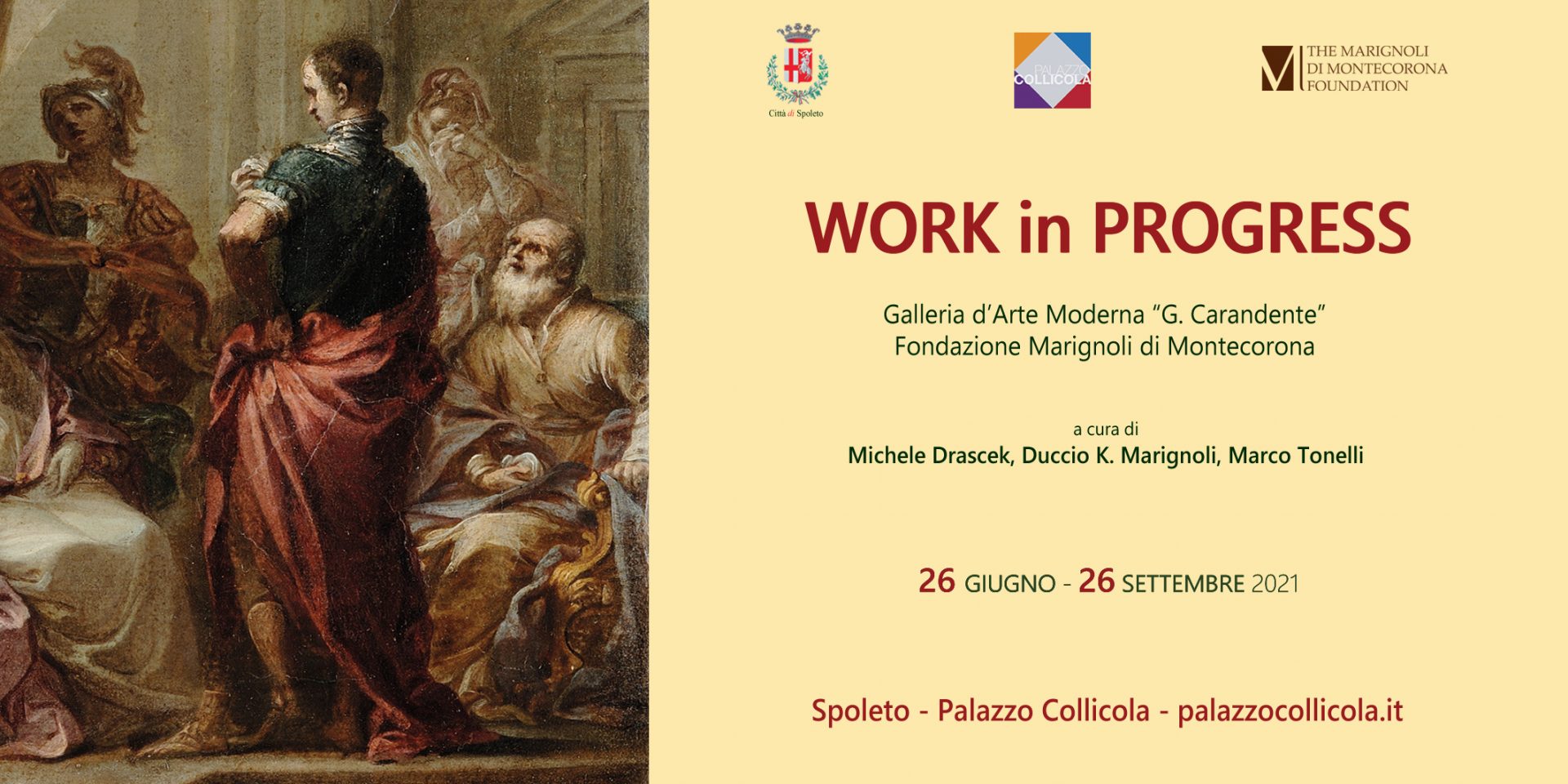 Seppure esposte su due differenti piani del museo di Palazzo Collicola (Salone d’Onore del Piano Nobile e Galleria d’Arte Moderna), le due collezioni offrono la possibilità di indagare in modo organico e di riflettere sul senso del work in progress e quindi sull’idea stessa di opera d’arte, di non finito, sul rapporto tra dimensioni immaginate e reali di un’opera, dipinto o scultore che sia. In sintesi, un’occasione che permette di chiarire, attraverso un tema comune a più epoche, la natura fluida, dinamica e sempre in divenire (di qui il titolo Work in progress) del processo artistico e della creazione di un’opera d’arte.