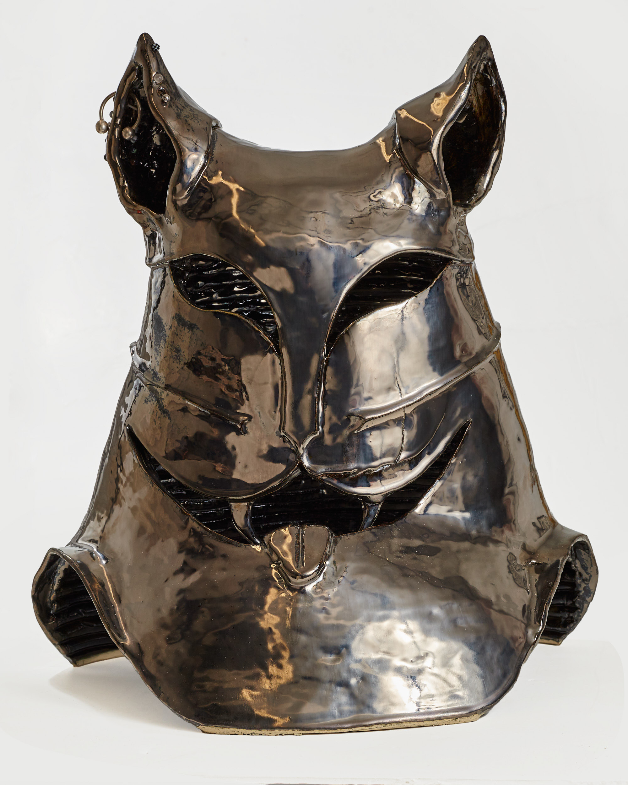 Le sculture in ceramica di Chloe Seibert, "CATSUIT WORK IN PROGRESS", affrontano le intersezioni tra fetish, fandom e armature medievali. Come possiamo prendere il controllo e scegliere i nostri avatar per muoverci al meglio in questo mondo aggressivo? Come può la fantasia stessa diventare un'arma di protezione?