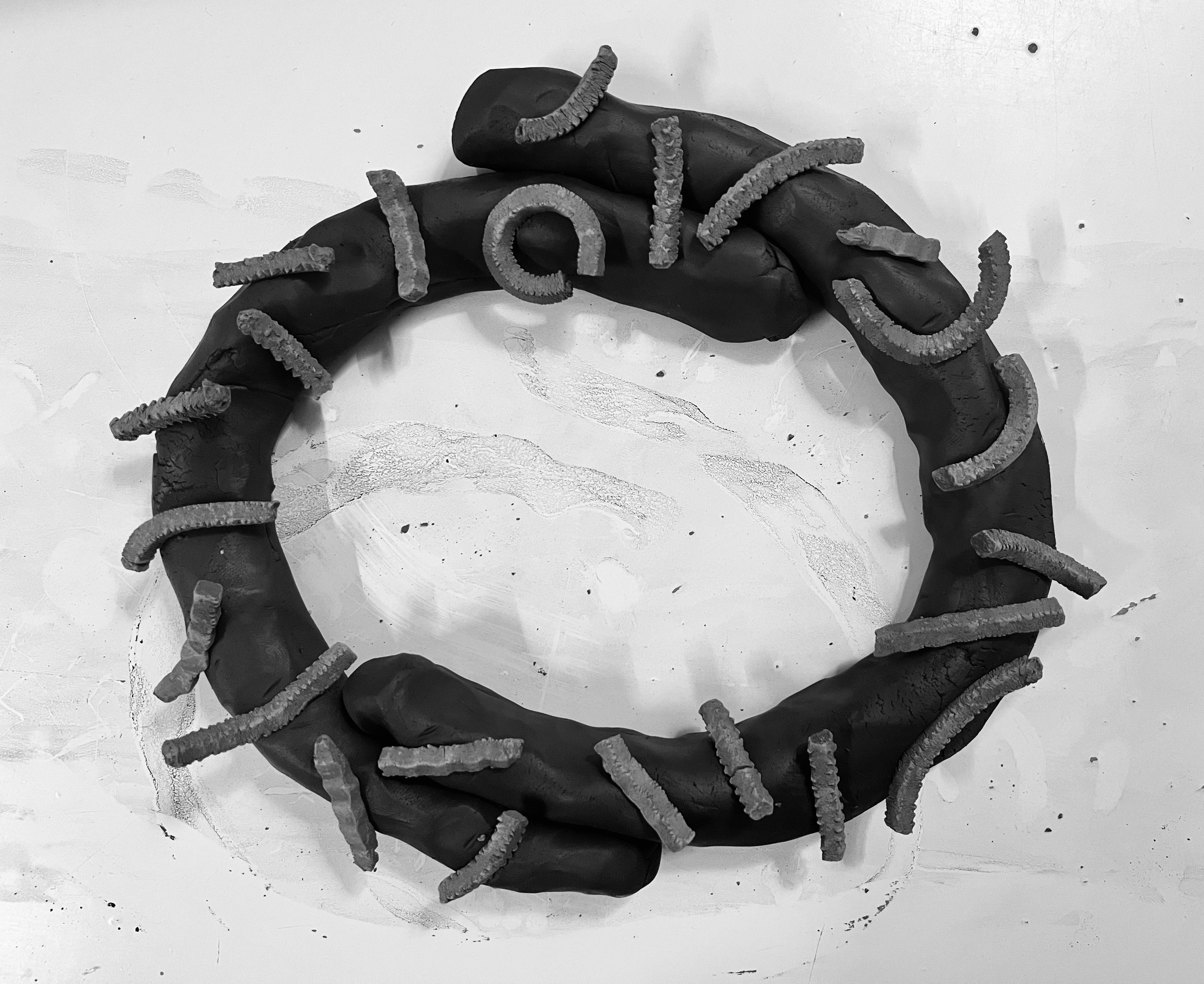 Le opere d'arte che ho creato durante il mio soggiorno al C.R.E.T.A. sono direttamente influenzate da una serie di sogni vividi che ho fatto nell'ultimo anno. Questi sogni presentavano vari incontri con serpenti velenosi: una pelle di serpente fresca che mi cadeva sulla mano a una festa, un grosso Copperhead nascosto sotto un edificio fatiscente in cui io e i miei amici d'infanzia stavamo per entrare, un duello mortale tra un Copperhead e un Cobra a una riunione di famiglia, con il risultato di un groviglio mummificato, un serpente grassoccio che rotolava lungo un vialetto, mancando di poco me e mia sorella mentre entravamo in un mercatino, e un serpente a sonagli che inseguiva e infine mordeva me e mio cugino dopo la cena del Ringraziamento. Con la guida del mio terapeuta, ho capito che questi serpenti simboleggiavano la mia ansia legata alla COVID, in quanto ho gradualmente alleggerito i miei protocolli e ho iniziato a partecipare alle riunioni senza maschere dopo essere stata iper-vigilante per tutto il periodo della pandemia.