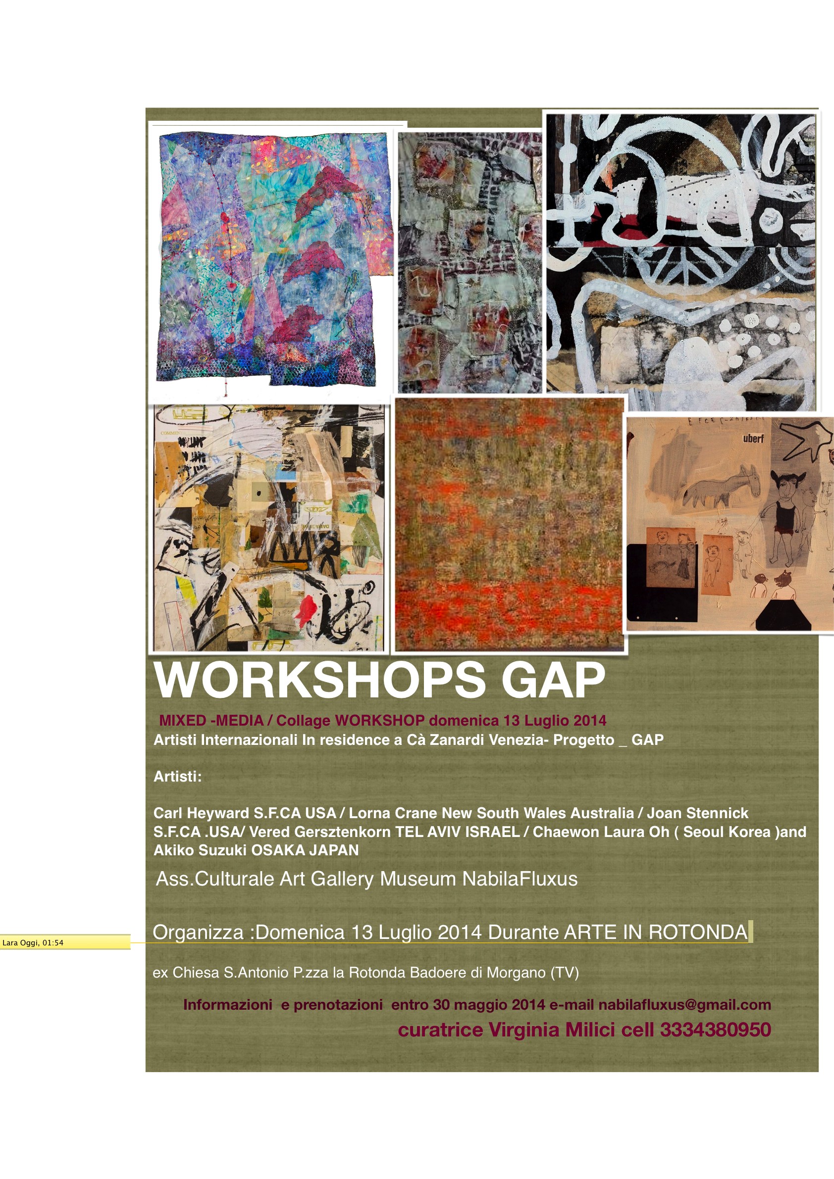 Le scrivo per informarla del progetto GAP (progetto artistico globale). Un gruppo di sei artisti provenienti dagli Stati Uniti, Australia, Corea, Giappone e Israele si incontrera’ in Italia a Venezia, nel mese di Luglio 2014 per svolgere mostre e workshop sfruttando diversi mezzi di comunicazione.