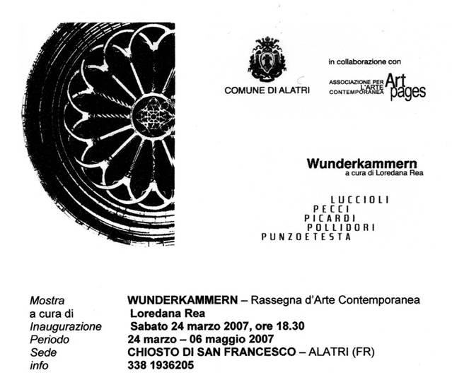 Sabato 24 marzo 2007, alle ore 18,30 ad Alatri (FR), presso il Chiostro di San Francesco, si inaugura WUNDERKAMMERN, mostra organizzata e coordinata dal Comune di Alatri in collaborazione con l’Associazione culturale ARTPAGES e curata da Loredana Rea.