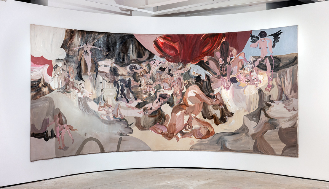 Quattro tele di forma circolare, simili a grandi rosoni che rivestono il soffitto ribaltando il punto di vista, invitano il pubblico a contemplare la pittura trasportando la visione su un piano cosmico e divino, oltrepassando il confine tra organico e macchinico, umano e animale. È in questo modo che Wynnie Mynerva crea un microcosmo in cui la pittura, fatta di luci e ombre e di strati densi di colore, manifesta l’apertura verso un nuovo futuro, mescolandosi alla natura e all’universo.