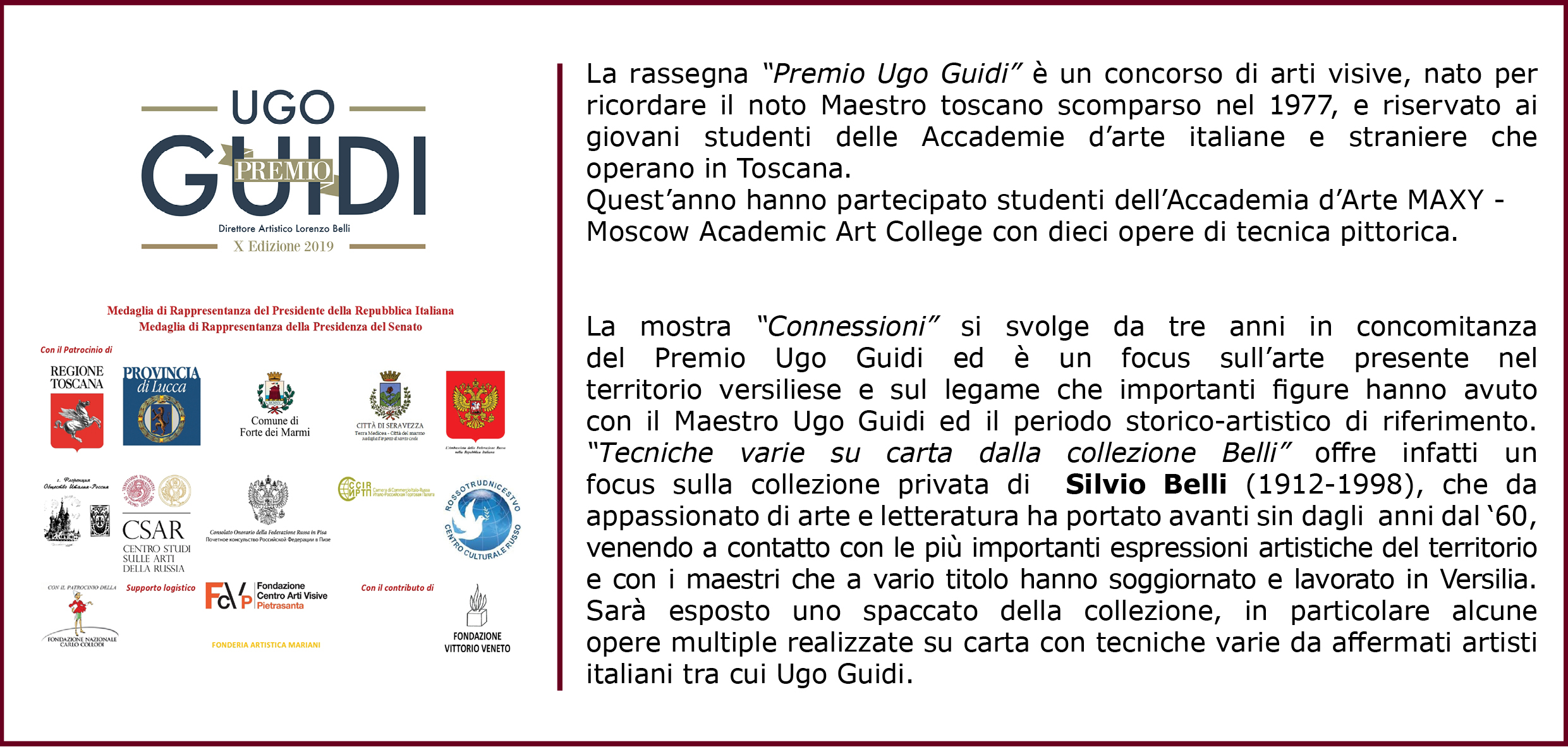 La mostra “Connessioni” si svolge da tre anni in concomitanza del Premio Ugo Guidi ed è un focus sull’arte presente nel territorio versiliese e sul legame che importanti figure hanno avuto con il Maestro Ugo Guidi ed il periodo storico-artistico di riferimento.