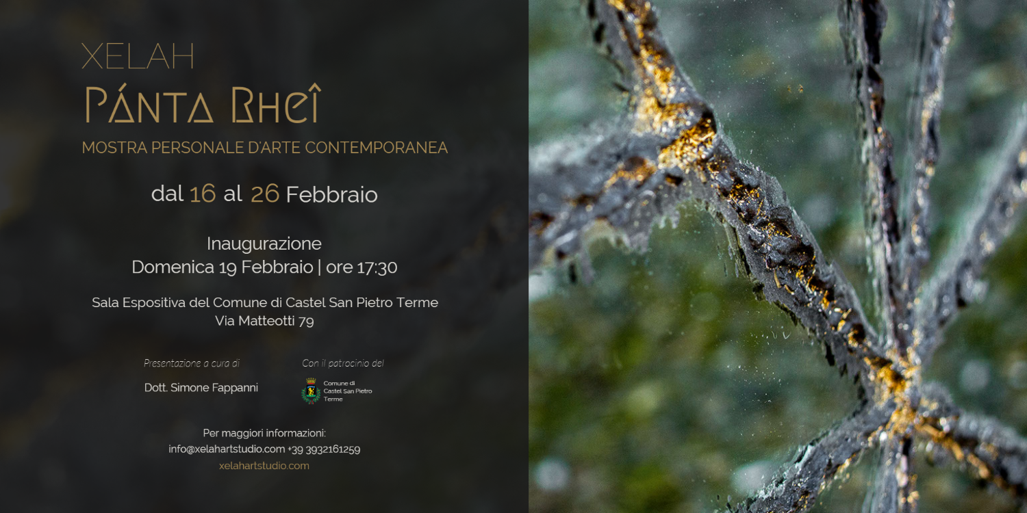Domenica 19 febbraio alle ore 17.30 il Dott. Simone Fappanni, curatore e critico d’arte presenta presso la Sala Espositiva del Comune di Castel San Pietro Terme, la personale di Xelah ispirata al celebre aforisma “Pánta rheî”, tutto scorre.