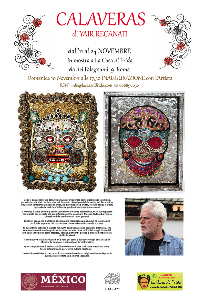 Yair Recanati, ex ambasciatore di Israele in Messico nonché artista eclettico e in continua evoluzione, presenterà la sua nuova mostra itinerante CALAVERAS presso La Casa di Frida, in via dei Falegnami 9 a Roma, centro storico, patrocinata dall'Ambasciata del Messico in Italia