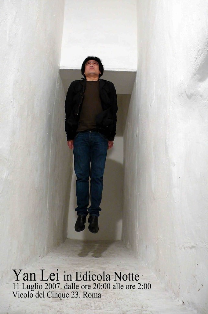 Yan Lei (Hebei 1965), artista internazionalmente riconosciuto come uno degli esponenti più rappresentativi della nuova scena artistica cinese, presenta un’opera appositamente realizzata per Edicola Notte. Questo suo nuovo lavoro fa i conti con lo spazio in modo duplice. Da una parte perché, come è consuetudine della “galleria”, la sua installazione fotografica aderisce e fa i conti con l’angusto spazio proponendosi come una grande light-box; dall’altra perché l’opera cattura e “ruba” la storia recente di Edicola Notte: l’installazione di Yan Lei difatti “copia” o memorizza la precedente installazione “Compro Oro” realizzata da Bruna Esposito. Nelle intenzioni di Yan Lei, qui alla sua prima personale romana, questa operazione di “furto” e “ricalco” è concepita come una sorta di doppio omaggio, sia allo spazio sia, naturalmente, al lavoro di Bruna Esposito. Omaggio illusionistico, anche provocatorio e irriverente all’apparenza, che ripete certi criteri e modalità operative che contraddistinguono l’operato dell’artista. Yan Lei spesso si appropria del già fatto e del già pensato, di immagini altrui, di immagini dell’arte e le elabora (fotograficamente, pittoricamente o in video) ricontestualizzandole come in una dimensione e spazio reale-virtuale della memoria collettiva, come per affrontare o sottolineare alcune questioni relative al senso che l’arte ed il visivo assumono oggi nella nostra vita.