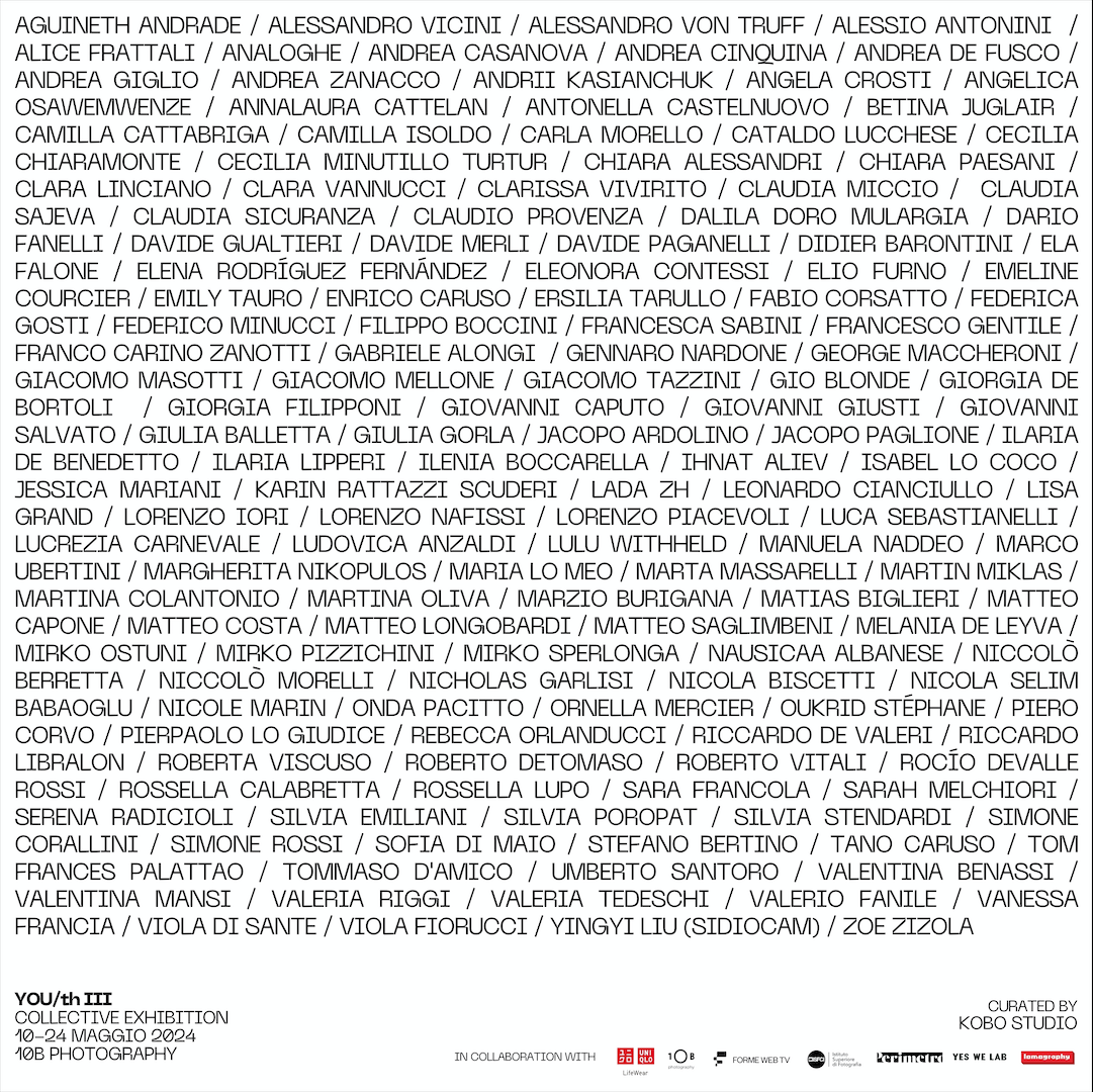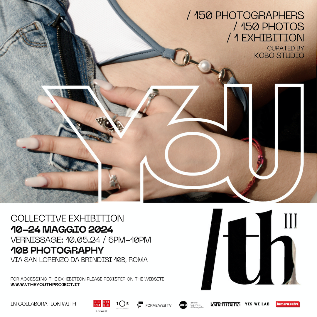 La terza edizione di "YOU/th", dal giorno 10 al giorno 24 maggio 2024, verrà ospitata dalla galleria 10b Photography di Francesco Zizola in via S.Lorenzo da Brindisi 10b, e vedrà esposte 150 immagini appartenenti a 150 fotografi differenti, provenienti da varie parti d’Europa e del mondo.