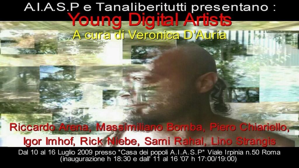 Venerdì 10 Luglio 2009 presso i locali della Casa dei Popoli A.I.A.S.P si inaugura la mostra Young Digital Artists, frutto di un lavoro di monitoraggio svolto per il tutto il corso della primavera 2009 dalla curatrice Veronica D’Auria riguardo alle produzioni audiovisive digitali di ricerca realizzate da parte di giovani artisti. Alcuni degli autori selezionati, ad esempio Riccardo Arena, Igor Imhof e Lino Strangis hanno già partecipato ad importanti mostre internazionali e il loro lavoro è per lo più già materia degli specialisti del settore, Rick Niebe ha mostrato le sue opere nei video-festival di vari paesi europei. Altri come Piero Chiariello e Massimiliano Bomba si sono fatti conoscere prevalentemente per altri generi di produzione artistica e Sami Rahal (già compositore video-operatore e sound Artist) per la prima volta in assoluto esporrà una sua installazione audiovisiva monocanale. Si è voluto offrire un piccolo sguardo panoramico su alcune specifiche procedure pur lasciando il tema assolutamente libero: “Ho cercato di dare un taglio spaziante, di intercettare alcune delle modalità attualmente ricercate per valorizzare le possibilità di produzione e non di ri-produzione degli strumenti utilizzati, ciò che più m’interessa sono le opere capaci di “fondare un mondo”, quelle che dichiarano esplicitamente di non aver alcuna intenzione di riprodurre realtà ma di ampliarla, mutarla, turbarla con la loro sola presenza… Non ho tenuto conto delle specifiche tecniche e sottogeneri a cui queste opere potrebbero essere ricondotte ma solo di questo e della presenza di un buon rapporto estetica/concetto (Veronica D’Auria). Sono presenti infatti animazioni e video elaborazioni di “coefficiente tecnico variabile”, (dalle complesse e definitissime animazioni di Riccardo Arena si giunge a quelle semplici, minimali di Piero Chiariello, all’incontro delle pitture rupestri e animazione digitale proposto da Imhof) nonché frutti di diversificati approcci alla composizione audiovisiva e alla costruzione del senso: mentre per le opere di Lino Strangis, Sami Rahal e Rick Niebe le elaborazioni del ripreso in fase di post-produzione assumono un’importanza linguistica notevole nella formazione delle stratificazioni di senso, il linguaggio di Massimiliano Bomba concentra la sua attenzione sulla forza comunicativa del registrato (tra l’altro non girato dallo stesso autore bensì ritrovato in seguito ad una operazione di carattere quasi archeologico). Caratteristiche peculiare dell’esposizione sono che tutte gli artisti utilizzeranno i televisori e schermi di pc riciclati dal lab. Multimediale di Tanaliberitutti e che le installazioni proposte non si esporranno in una medesima sala, saranno bensì “disseminate” lungo l’ampio spazio della Casa dei Popoli A.I.A.S.P. dialogando con l’architettura.